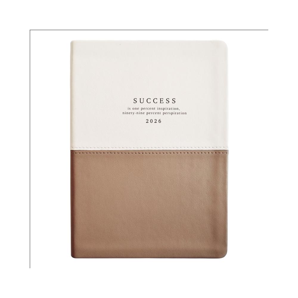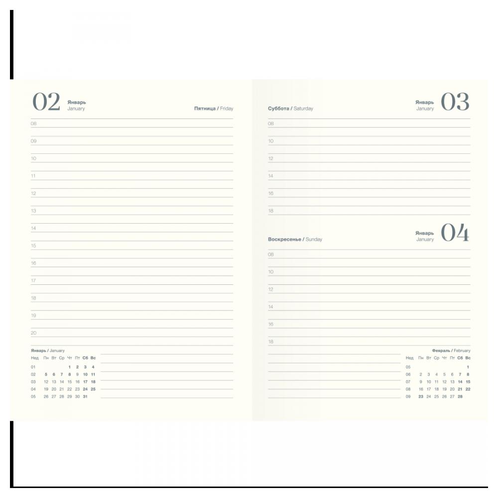 Ежедневник выполнен в премиальном дизайне, сочетающем стиль и функциональность. Обложка интегральная, из мягкой фактурной искусственной кожи в элегантной комбинации белого и бежевого цветов. Дополнительным декоративным акцентом служит отделка белой шелкографией, а также две аккуратные прострочки в цвет материала, подчёркивающие изысканность изделия. Внутренний блок включает 352 датированные страницы, выполненные на бумаге цвета слоновой кости плотностью 70 г/м², со скруглёнными уголками для удобства и аккуратного внешнего вида. Записи печатаются в формате 1+1, что обеспечивает чёткое и лаконичное оформление. Для удобной навигации предусмотрены две цветные ляссе, позволяющие быстро находить нужные разделы. Такой ежедневник гармонично сочетает практичность и эстетичность, становясь надёжным инструментом планирования и стильным аксессуаром.