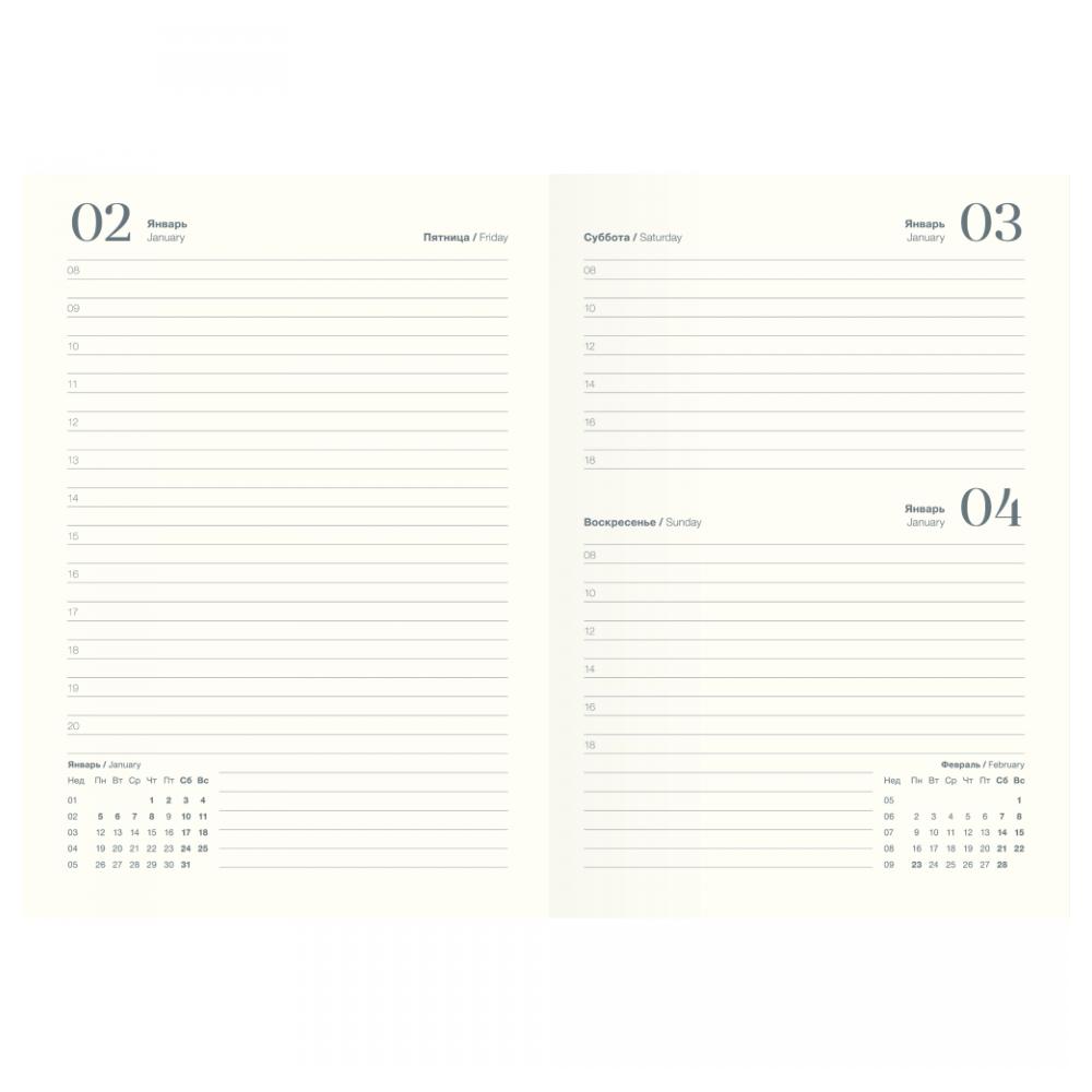 Ежедневник выполнен в твердой обложке из тактильно приятной искусственной кожи. Обложка оснащена эластичной резинкой того же оттенка для надежного закрытия и держателя для ручки. Внешний дизайн украшен элегантным тиснением золотой фольгой, что придает изделию изысканный вид. Внутри находится датированный блок на 352 страницы из бумаги цвета слоновой кости плотностью 70 г/м². Страницы имеют скругленные уголки, что придает ежедневнику аккуратный и завершённый внешний вид. Дополнительные удобства включают кармашек для заметок и две ляссе для удобной навигации — все элементы, включая резинку и ляссе, выполнены в цвет обложки для гармоничного образа.