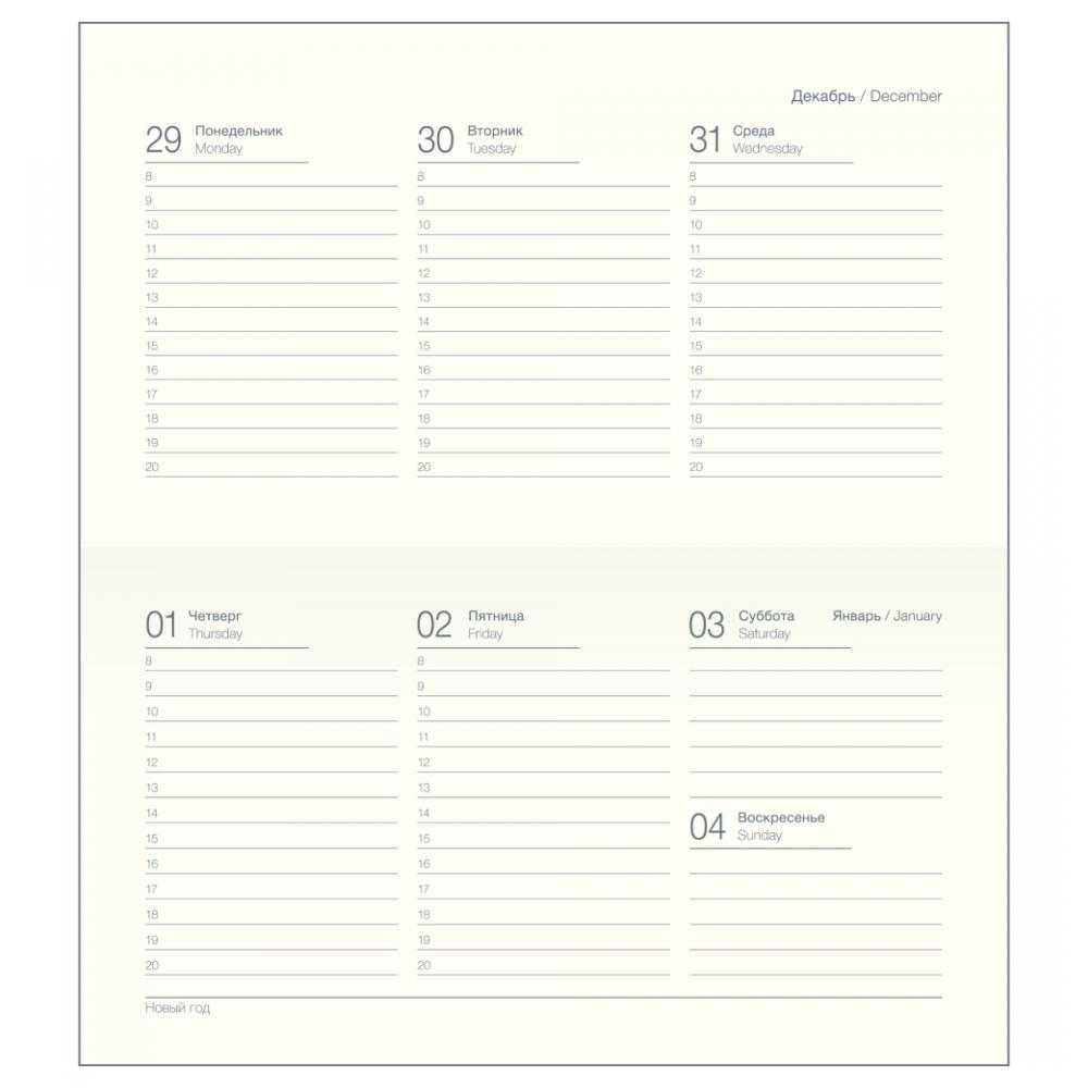 Обложка - твердая, тактильно приятная искусственная кожа. Блок - датированный, 128 страниц, скругленные уголки, 1 ляссе. Бумага: слоновая кость, скругленные уголки, 70 г/м2. Особенности: тиснение золотой фольгой, ляссе в цвет обложки. Цвет - светло-коричневый.