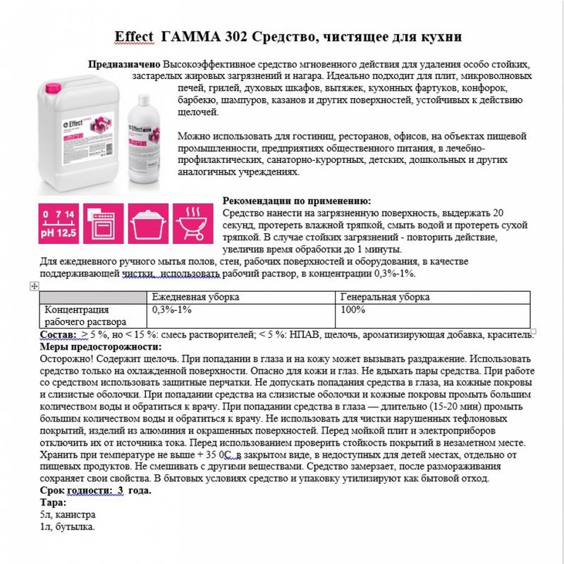 Средство чистящее для кухни Effect Gamma 302. Назначение: Предназначено Высокоэффективное средство мгновенного действия для удаления особо стойких, застарелых жировых загрязнений и нагара. Идеально подходит для плит, микроволновых печей, грилей, духовых шкафов, вытяжек, кухонных фартуков, конфорок, барбекю, шампуров, казанов и других поверхностей, устойчивых к действию щелочей. Можно использовать для гостиниц, ресторанов, офисов, на объектах пищевой промышленности, предприятиях общественного питания, в лечебно-профилактических, санаторно-курортных, детских, дошкольных и других аналогичных учреждениях. Способ применения: Средство нанести на загрязненную поверхность, выдержать 20 секунд, протереть влажной тряпкой, смыть водой и протереть сухой тряпкой. В случае стойких загрязнений — повторить действие, увеличив время обработки до 1 минуты. Для ежедневного ручного мытья полов, стен, рабочих поверхностей и оборудования, в качестве поддерживающей чистки, использовать рабочий раствор, в концентрации 0,3%-1%. Меры предосторожности: Осторожно! Содержит щелочь. При попадании в глаза и на кожу может вызывать раздражение. Использовать средство только на охлажденной поверхности. Опасно для кожи и глаз. Не вдыхать пары средства. При работе со средством использовать защитные перчатки. Не допускать попадания средства в глаза, на кожные покровы и слизистые оболочки. При попадании средства на слизистые оболочки и кожные покровы промыть большим количеством воды и обратиться к врачу. При попадании средства в глаза — длительно (15–20 минут) промыть большим количеством воды и обратиться к врачу. Не использовать для чистки нарушенных тефлоновых покрытий, изделий из алюминия и окрашенных поверхностей. Перед мойкой плит и электроприборов отключить их от источника тока. Перед использованием проверить стойкость покрытий в незаметном месте. Хранить при температуре не выше +35°C в закрытом виде, в недоступных для детей местах, отдельно от пищевых продуктов. Не смешивать с другими веществами. Средство замерзает, после размораживания сохраняет свои свойства. В бытовых условиях средство и упаковку утилизируют как бытовой отход. Условия хранения: Хранить в сухом прохладном месте. Предохранять от попадания прямых солнечных лучей. Состав: ≥ 5 %, но < 15 % щелочь; НПАВ; смесь растворителей; < 5 % ароматизирующая добавка. Срок годности: 3 года.