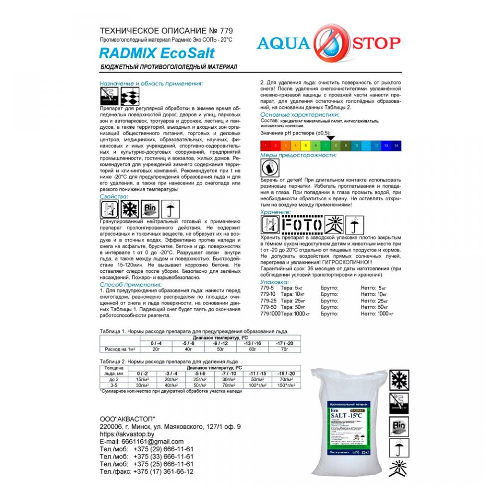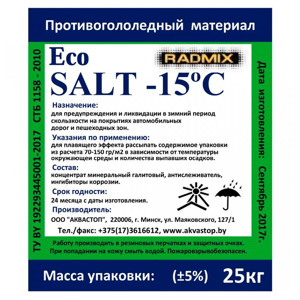 Радмикс Эко COЛЬ – новый антигололедный реагент, главные преимущества которого простота использования, длительное действие и минимальный вред растениям и животным. Радмикс Эко – универсальный и современный способ борьбы с гололедом. Реагент состоит из солей натрия и калия, поэтому безопасен для обуви пешеходов, лап животных, состояния колес автомобиля, почвы и деревьев. Он полностью соответствует всем государственным стандартам. Радмикс Эко работает при температурах до минус двадцати градусов, а по цене доступен всем потребителям. Радмикс Эко обладает хорошей плавящей способностью. В кратчайшие сроки лед под его воздействием разрушается, после чего его остается только убрать. Реагент можно рассыпать вручную либо с применением специализированной техники. Ингибиторы коррозии, входящие в его состав, защищают металлические поверхности от разрушения. Радмикс Эко имеет сбалансированный состав и эффективно воздействует на ледяную корку. Вступая с ней в термическую реакцию, он быстро растапливает лед. Средний расход составляет примерно 70 г. на один квадратный метр. Препарат начинает работать через пятнадцать минут после нанесения. Радмикс Эко применяется на любой местности и работает при температурах от 0 до -20 градусов. Он отлично подходит для обработки тротуаров и других пешеходных зон. Он позволит избежать многих проблем, возникающих в зимний период из-за гололеда и снежных накатов. Преимущества: • Препарат сохраняет работоспособность при температурах до минус двадцати градусов. Особенно он актуален при обработке дорожных покрытий ранним утром, до начала оживленного движения. • Специально подобранная смесь на основе хлорида кальция и натрия – экологичная формула в грамотно подобранных пропорциях. • Быстрая реакция – первичный слой наледи схватывается с реагентом в первые пятнадцать минут. За полтора часа Эко полностью проникает в структуру льда и обеспечивает максимально эффективное воздействие. • Экономичный расход. Реагент следует хранить в условиях, исключающих нарушение целостности упаковки и проникновение влаги. До начала использования не допускается продолжительный контакт препарата с воздухом. Возможно хранение реагента на открытых площадках под навесом на поддонах, скрепленных стрейч-пленкой. Препарат нетоксичен, не выделяет вредных веществ и при условии правильного использования абсолютно безопасен.