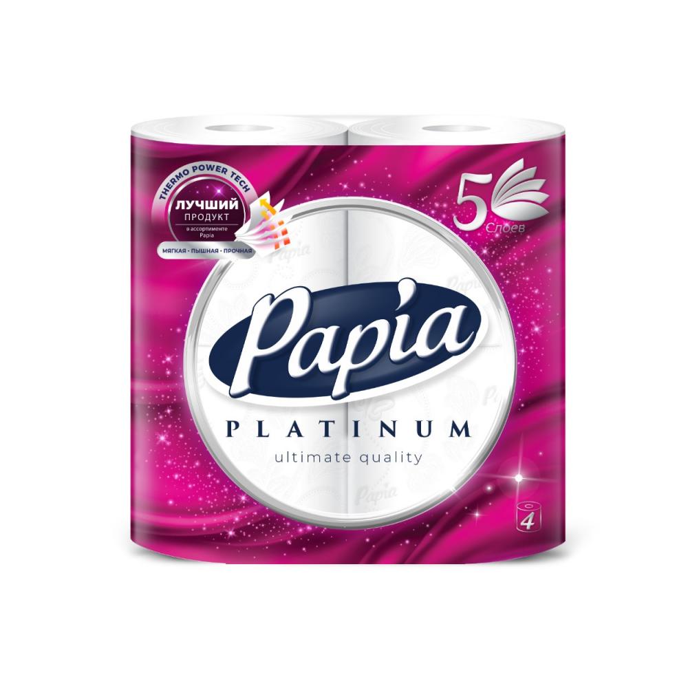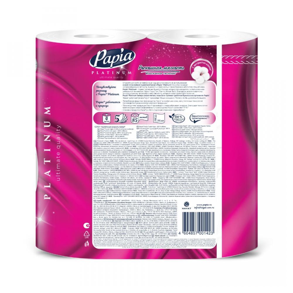 Откройте для себя неповторимые ощущения комфорта от использования пятислойной туалетной бумаги Papia Platinum. Она обеспечивает непревзойденную мягкость, пышность и прочность, а также бережно заботится о Вашей коже. Papia Platinum производится с использованием уникальной технологии Термо Пауэр Тэк (Thermo Power Tech). Papia Platinum – самая мягкая, пышная и прочная туалетная бумага в ассортименте Papia. Преимущества: Изысканное тиснение. С экстрактом хлопка. Дерматологически протестирована и одобрена. Характеристики: Длина рулона: 11,9 м. Ширина рулона: 106 см. Количество листов: 85. Длина листа: 14 см. Слойность: 5. Материал: 100% целлюлоза. Тиснение: да. Цвет: белый. Условия и сроки хранения: Хранить в закрытых помещениях, защищенных от атмосферных осадков и почвенной влаги, на расстоянии не менее 1 м от отопительных устройств. Срок годности не ограничен.