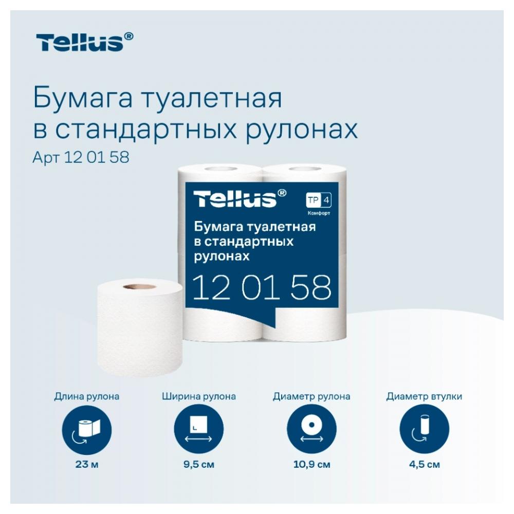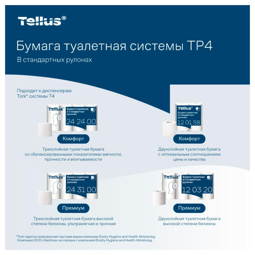 Двуслойная туалетная бумага Tellus в стандартных рулонах категории качества Комфорт отлично подходит для туалетных комнат с низкой и средней проходимостью. Изготовлена из 100% переработанных материалов. Закрытая конструкция диспенсеров Tork системы T4 надежно защищает рулоны от загрязнений, что способствует улучшению гигиеничности и комфорта в использовании. Оптимальное соотношение цены и качества. Система: Т4 – Туалетная бумага в стандартных рулонах. Характеристики: Длина рулона: 23 м. Ширина рулона: 9,5 см. Диаметр рулона: 10,9 см. Количество листов: 184. Длина листа: 12,5 см. Внутренний диаметр втулки: 4,5 см. Слойность: 2. Материал: переработанное сырье. Тиснение: да. Цвет: белый. С данным товаром покупают: Диспенсер ТОРК д/туалетной бумаги в стандартных рулонах, белый, Т4 (арт. 9003841, 985484) Диспенсер ТОРК д/туалетной бумаги в стандартных рулонах, черный, Т4 (арт. 9003086) Условия и сроки хранения Хранить в закрытых помещениях, защищенных от атмосферных осадков и почвенной влаги, на расстоянии не менее 1 м от отопительных устройств. Срок годности не ограничен.