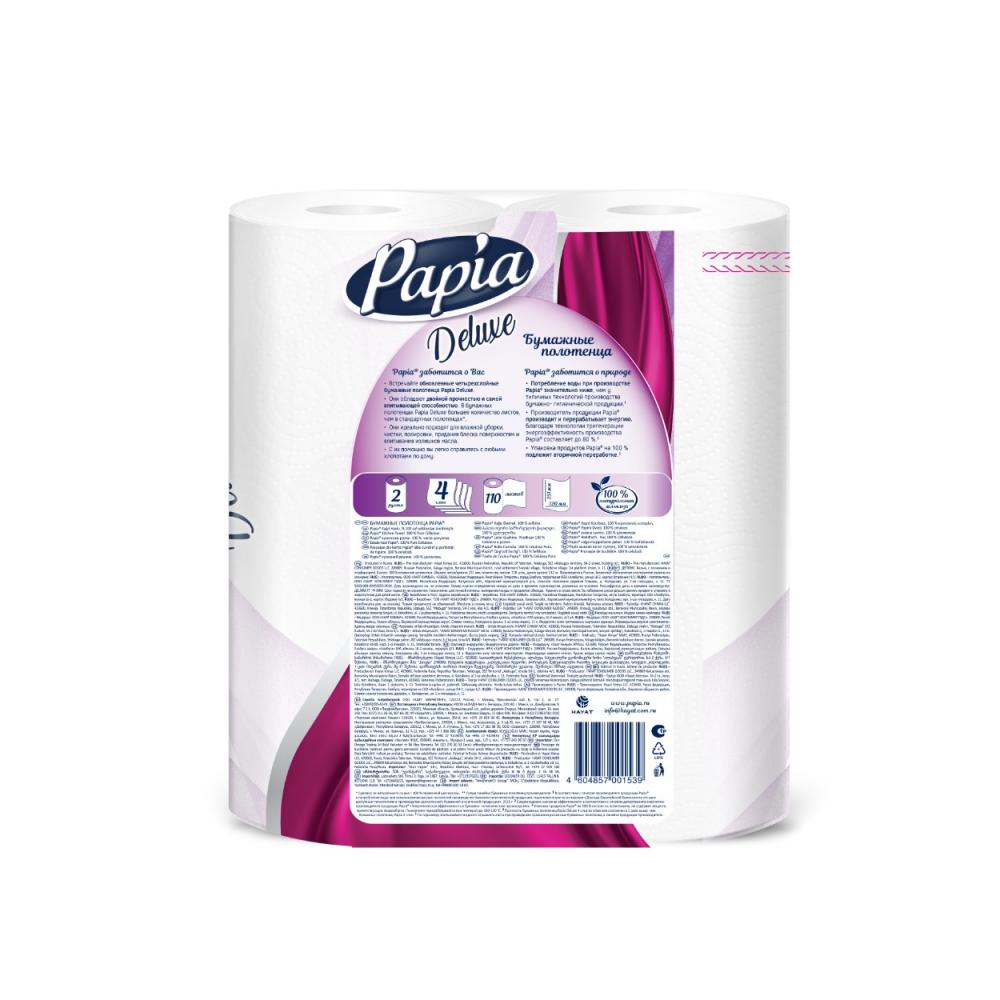 Бумажные полотенца Papia Deluxe обладают двойной прочностью и самой впитывающей способностью из ассортимента Papia. Рулон содержит большее количество листов, чем в стандартных полотенцах Papia. Преимущества: Oни идеально подходят для влажной уборки, чистки, полировки, придания блеска поверхностям и впитывания излишков масла. С их помощью можно легко справиться с любыми хлопотами по дому. Безопасны при контакте с едой. Характеристики: Длина рулона: 13,2 м. Количество листов: 110. Длина листа: 12 см. Ширина листа: 25,1 см. Слойность: 4. Материал: 100% целлюлоза. Тиснение: да. Цвет: белый. Условия и сроки хранения: Хранить в закрытых помещениях, защищенных от атмосферных осадков и почвенной влаги, на расстоянии не менее 1 м от отопительных устройств. Срок годности не ограничен.