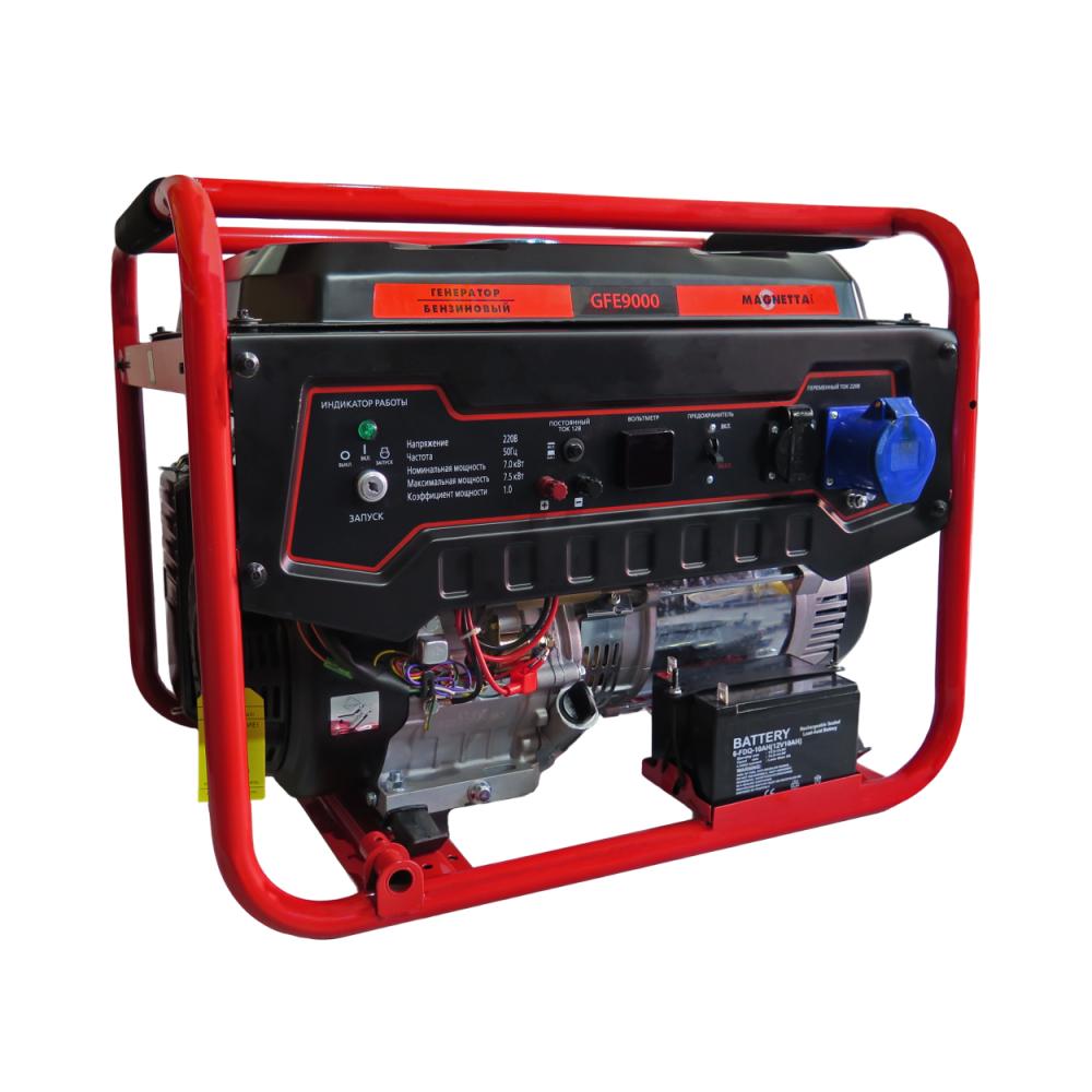 Бензиновый генератор Magnetta GFE9000 — это надёжный и мощный источник автономного электропитания, идеально подходящий для резервного снабжения дома, работы на строительных объектах, в мастерских и при выездных работах. Благодаря медной обмотке альтернатора, цифровому дисплею и продуманной системе защиты, он обеспечивает стабильную работу и удобство эксплуатации. Основные характеристики: Тип топлива: бензин Тип стартера: ручной / электрический Автоматический ввод резерва (АВР): опционально Номинальная мощность: 7 кВт Максимальная мощность: 7.5 кВт Напряжение сети: 220–230 В Частота тока: 50/60 Гц Количество фаз: 1 Тип двигателя: 1-цилиндровый, 4-тактный, воздушного охлаждения Рабочий объём двигателя: 439 см³ Объём топливного бака: 25 л Объём масла: 1.1 л Минимальный расход топлива: 313 г/кВт·ч Время непрерывной работы: до 7 часов Уровень шума: 78 дБ Габариты: 695×530×560 мм Вес: 87 кг Дополнительные особенности: Медная обмотка альтернатора — для надёжной и долговечной работы Многофункциональный цифровой дисплей — отображает напряжение, частоту и моточасы Выходы: 1 розетка на 16 А, 1 розетка на 32 А, выход постоянного тока 12 В Предохранитель и защита от низкого уровня масла Низкий уровень шума и экономичный расход топлива