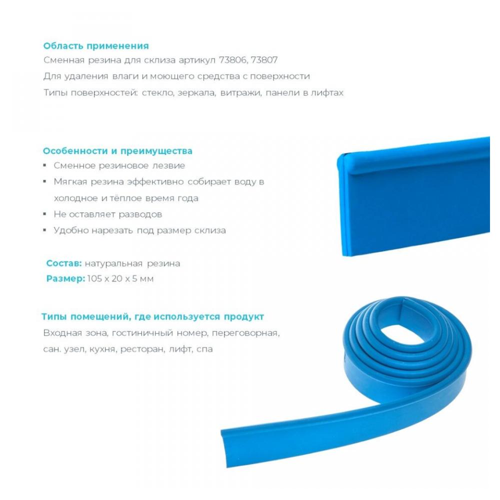 Сменное резиновое лезвие, рулон 105 см. Можно отрезать лезвие любой длины. Область применения: Для удаления влаги и моющего средства с поверхности; Типы поверхностей: стекло, зеркала, витражи, панели в лифтах. Особенности и преимущества: Сменное резиновое лезвие; Мягкая резина эффективно собирает воду в холодное и тёплое время года; Не оставляет разводов; Удобно нарезать под размер склиза. Характеристики: Размер: 105 х 2 х 0,5 см. Вес 76+/-2 г. Состав: натуральная резина. Цвет: синий. С данным товаром покупают сгон для удаления влаги для окон, 35 см (арт. 997079). Условия и сроки хранения: Хранить при температуре не выше +35°С. Защищать от действия прямых солнечных лучей. Хранить в недоступном для детей месте. Срок годности не ограничен при соблюдении условий хранения.