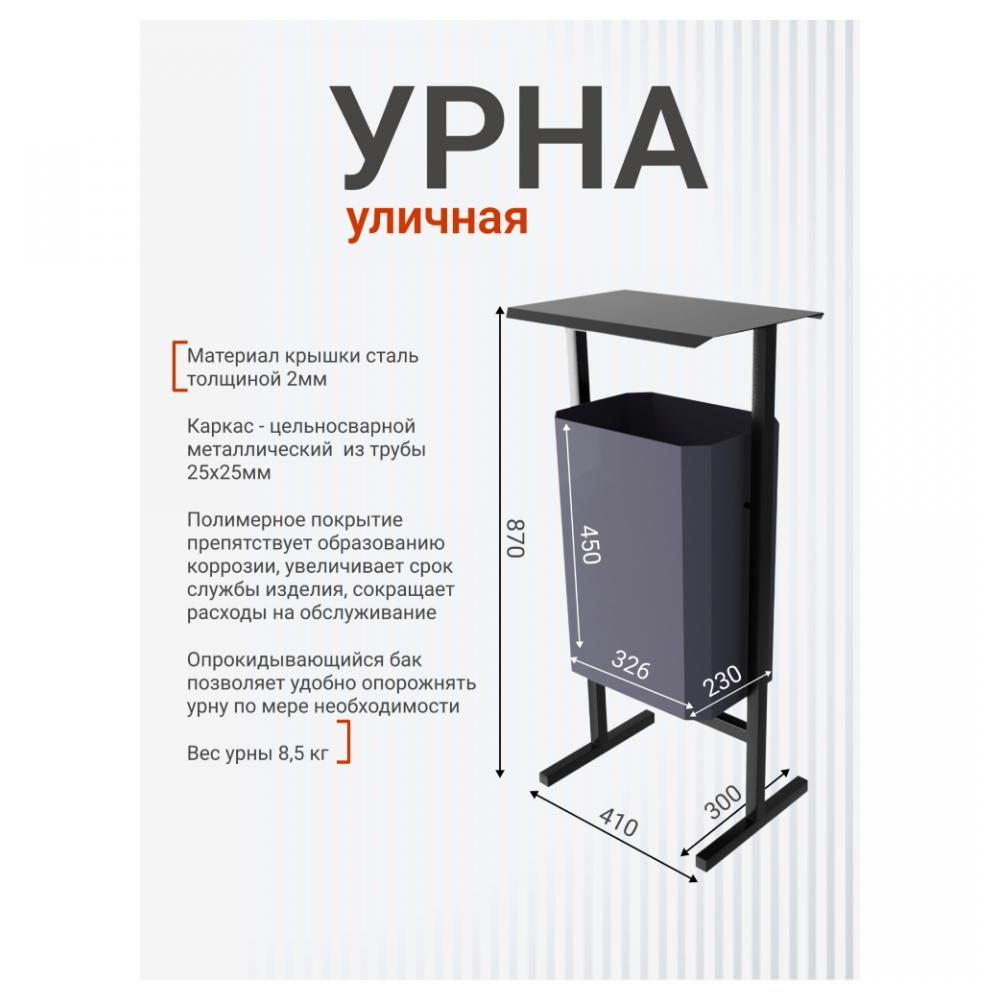 Современная металлическая урна "СТАНДАРТ 35л" Урна сочетание современного дизайна, прочности и практичности, разработанное для поддержания чистоты и эстетики в общественных и коммерческих пространствах. Ее лаконичная форма и строгие линии позволяют гармонично вписать урну в любой интерьер или экстерьер, не перегружая пространство. Устойчивая металлическая рама гарантирует долговечность, а удобная конструкция делает обслуживание простым и быстрым. Отличительные особенности: полимерно-порошковое покрытие, которое нанесено как на внешнюю сторону бака, но и на внутреннюю. За счет такого нанесения покрытия увеличиваются срок службы изделия. Полимерное покрытие предотвращает появления коррозии, царапин и сколов, устойчиво к высоким температурам, не выгорает на солнце. Бак поворотный объемом 35 литров, что облегчает извлечение мусора. Прочность и долговечность: Каркас и бак полностью выполнены из высококачественного металла, что обеспечивает длительный срок службы даже при интенсивной эксплуатации на улице. Эстетичный внешний вид: Минималистичный дизайн гармонично вписывается в любую современную городскую среду, интерьеры бизнес-центров, отелей, кафе и входных групп зданий. Удобство в обслуживании: Поворотный, съемный внутренний контейнер легко вынимается для быстрой очистки и опустошения. Функциональная крышка: Урна оснащена крышкой, которая не только защищает содержимое от осадков, но и скрывает отходы, поддерживая опрятный вид. По вашему желанию, на крышке может быть дополнительно установлена пепельница. Области применения: Входные группы зданий, офисные пространства, коридоры бизнес-центров, гостиничные холлы, зоны отдыха, кафе и рестораны, а также уличные территории. Такие урны можно легко разместить на даче, в гараже, офисе, на территории детских садов и школ, на заднем дворе кофе и ресторанов. Характеристики: Каркас: труба профильная 25 × 25 мм Материал крышки: сталь 2мм, покраска полимерно-порошковая Крепление каркаса: анкерное (не входит в комплект поставки) Общие габариты урны: ДШВ 41 x 30 x 87 см Габариты бака: ДШВ 32.6 × 23 × 45 см Объем: 35 литров Общая высота урны: 87 см Такие урны можно легко разместить на даче, в гараже, офисе, на территории детских садов и школ, на заднем дворе кофе и ресторанов. Они отличаются высокой прочностью, лёгкостью и удобством в обслуживании, а также разнообразием расцветок.