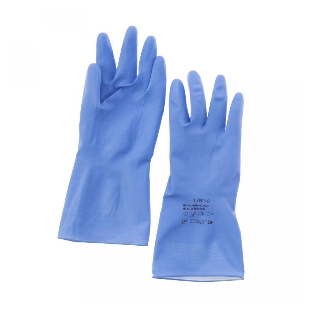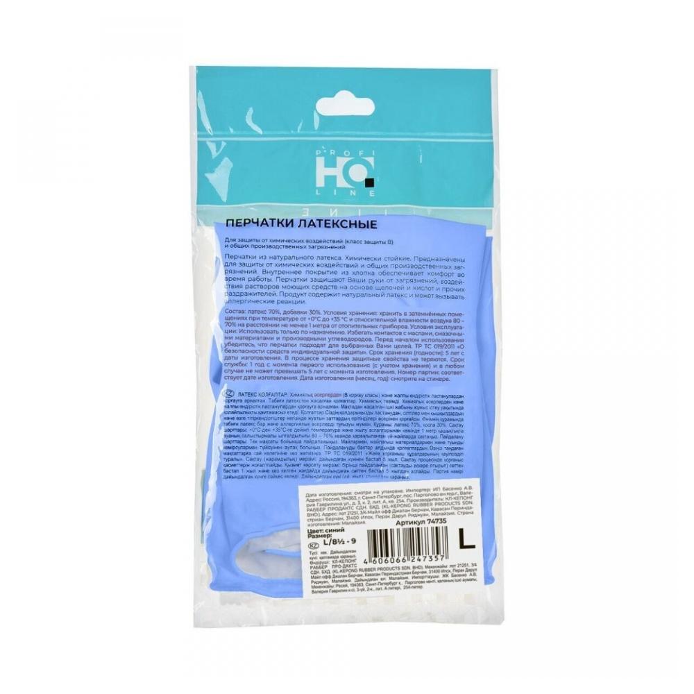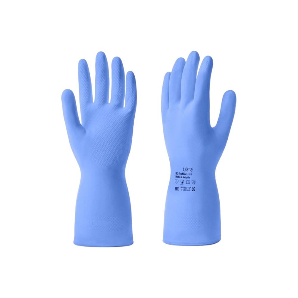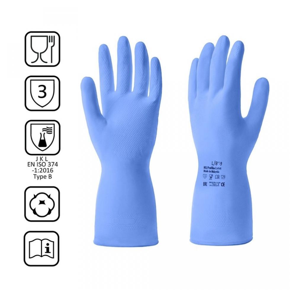Перчатки латексные для защиты от химических воздействий (класс защиты В) и общих производственных загрязнений. Химически стойкие. Внутреннее покрытие из хлопка обеспечивает комфорт во время работы. Перчатки защищают руки от загрязнений, воздействия растворов моющих средств на основе щелочей и кислот и может вызвать аллергические реакции. Особенности и преимущества: Есть цветовая кодировка для предотвращения перекрёстного загрязнения; Латекс прочный и эластичный, что обеспечивает перчаткам износостойкость и долговечность; Удобная анатомическая посадка на руке; Есть ролик на манжете, что облегчает надевание перчатки на руку (надевающая рука не соскальзывает по манжете); Хлопковое напыление создаёт комфорт при работе, помогает легко надевать и снимать перчатку и впитывает излишнюю влагу; Есть рельеф на ладони и пальцах для надежного захвата; Хорошая устойчивость к средствам содержащим кислоты и щёлочь (класс защиты B - J – гептан, K- гидроокись натрия (щелочь), L – серная кислота). Область применения: Для защиты рук во время уборки помещений; Можно применять при сухой и влажной уборке; Есть защита от кислот и щелочей, можно использовать с разведенными моющими средствами и дезинфектантами. Состав: 70 % натуральный латекс, 30 % добавки. Длина: 30 см +/- 0,5 см. Толщина: 0,30 - 0,35 мм. Ширина ладони: M – 10 ±0,5 см, L – 11 ±0,5 см. Вес пары: M – 50±3 г. L – 55±3 г. Условия и сроки хранения: Хранить в затемненных помещениях при температуре от 0°С до +30 °С и относительной влажности воздуха 80-70% на расстоянии не менее 1 метра от отопительных приборов. Условия эксплуатации: использовать только по назначению. Избегать контактов с маслами, смазочными материалами и производными углеводородов. Перед началом использования убедитесь, что перчатки подходят для выбранных целей. Срок хранения (годности): 5 лет с даты изготовления. Срок службы: 1 год с момента первого использования (с учетом правильного хранения) и в любом случае не может превышать 5 лет с момента изготовления. Дата изготовления указаны на упаковке.