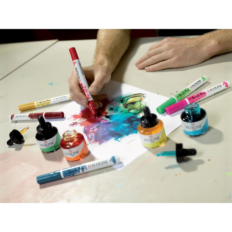 Жидкая акварель «Ecoline» создана на основе красителей и гуммиарабика. Удобная банка на 30 мл оснащена пипеткой для эффективного дозирования при смешивании цветов. Краски прозрачные, легко наносятся, хорошо смешиваются, оставляя чистые оттенки и отлично разводятся водой даже после высыхания. Акварель «Ecoline» подойдет для работы пером, кистью или аэрографом, широко используется в леттеринге, fashion-скетчинге и дизайне. В линейке представлено 60 ярких и насыщенных оттенков.