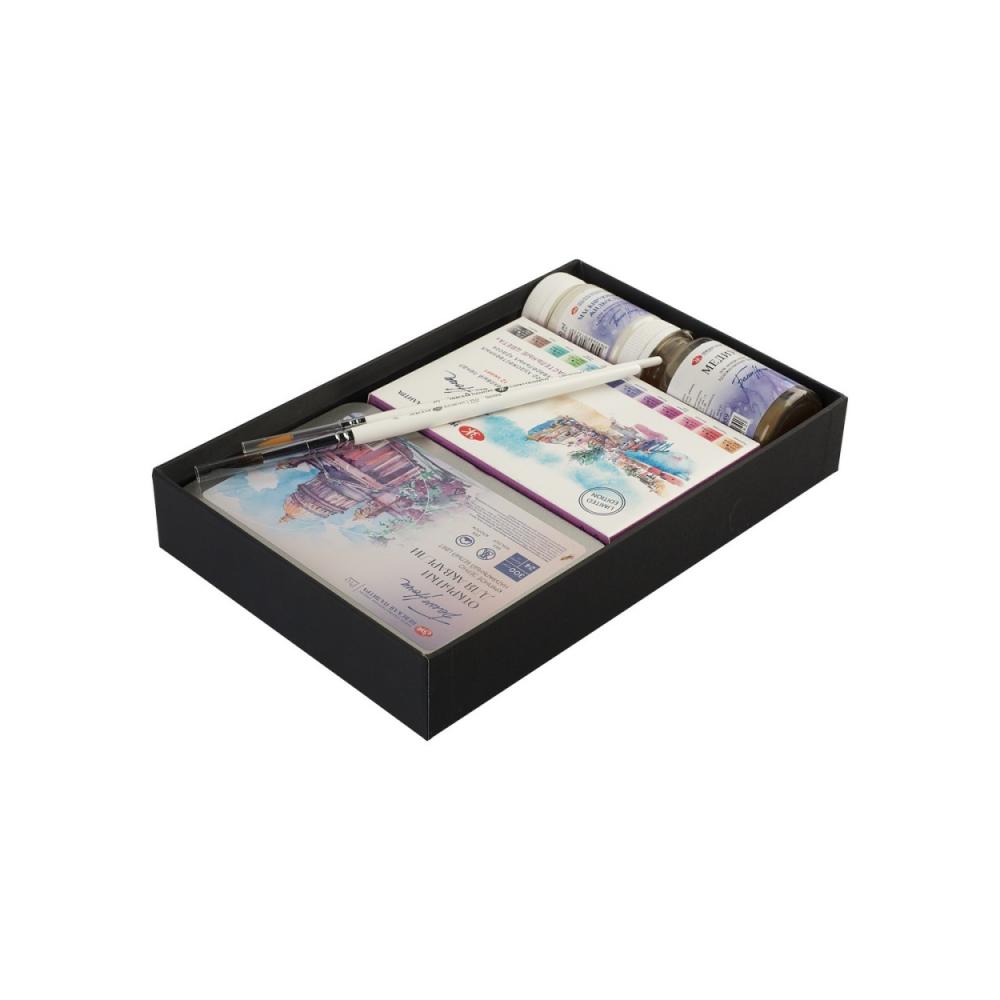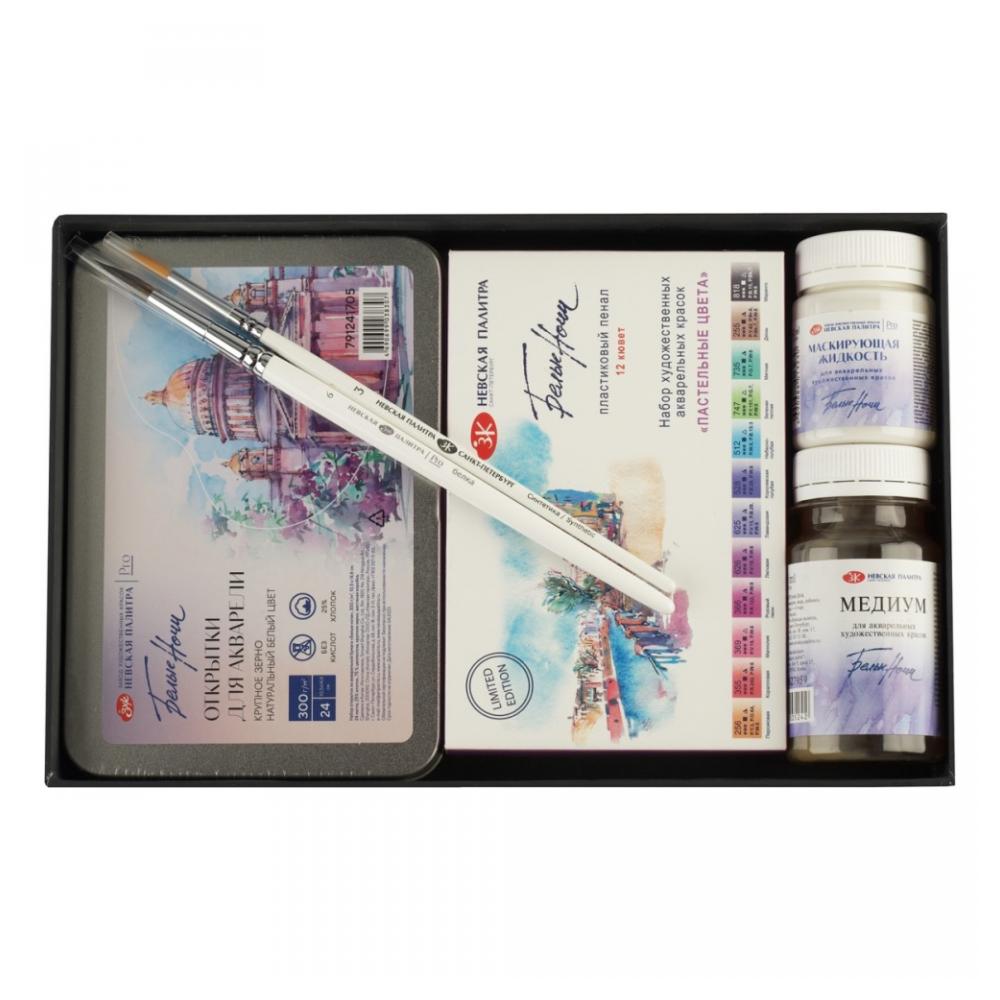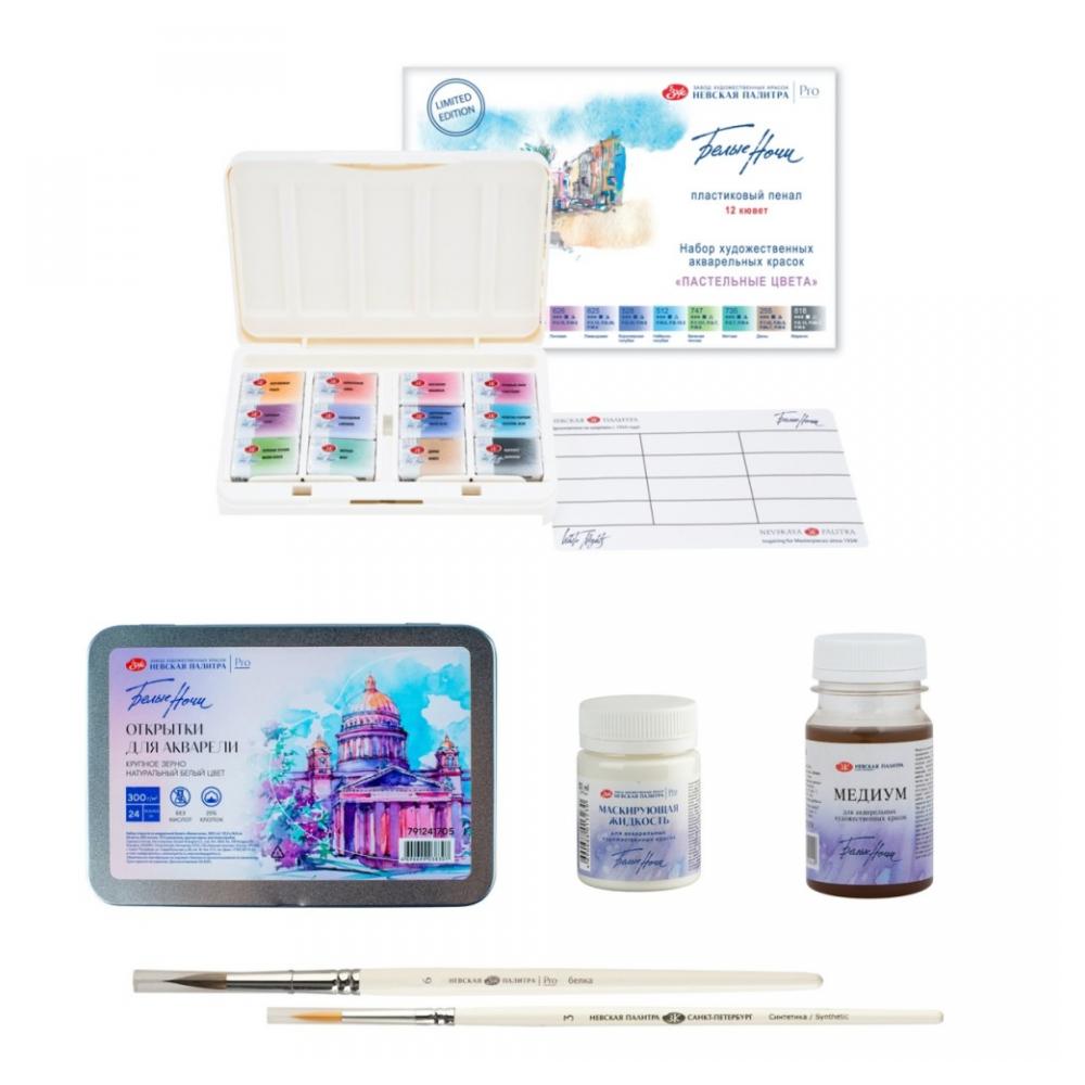 Акварель «Белые ночи» – визитная карточка завода, эти краски признаны профессиональными художниками и считаются одними из лучших среди отечественных акварелей. Акварель «Белые ночи» изготовлена из высококачественных тонко тертых пигментов и связующего с добавлением гуммиарабика. Цвета хорошо смешиваются между собой и легко размываются водой. Краска обладает высокой светостойкостью. Состав набора: 12 кювет по 2,5 мл акварели «Белые ночи» (пастельные цвета); Маскирующая жидкость для акварели «Белые ночи» банка 50 мл.; Медиум для акварели «Белые ночи» банка 100 мл; Набор открыток из акварельной бумаги «Белые ночи», 300 г/кв.м, 10,5 х 14,8 см, 24 листа, 25% хлопок, 75 % целлюлоза, крупное зерно, жестяная коробка; Кисть «Невская палитра» белка круглая, короткая ручка №6; Кисть из синтетики «Невская палитра», круглая, короткая ручка, №3.