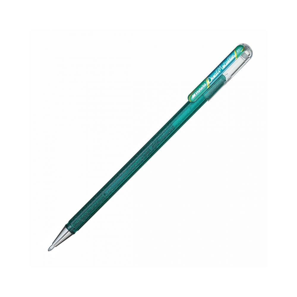Pentel Dual Metallic K110 это уникальная гелевая ручка, заправленная пигментными чернилами с добавлением блесток и пигмента, создающего эффект хамелеона. Цвета ручек меняются в зависимости от цвета бумаги и угла обзора. Теперь ничего не может быть проще, чтобы создать удивительные мерцающие картины или открытки. Двойной металлический наконечник толщиной 1,0 мм обеспечивает равномерную подачу чернил для супер гладкого письма. Гелевые чернила, используемые для производства наших ручек, не текут, быстро сохнут на бумаге, не размазываются и устойчивы к воздействию света, а значит вы на долго сохраните свои работы в первозданном виде.