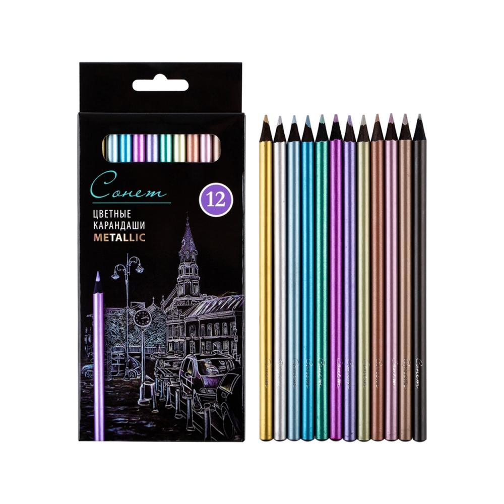 Набор цветных карандашей Сонет Metallic идеален для создания специальных эффектов - сверкающих бликов и отсветов, капель воды и блеска металла. Стильный черный корпус карандашей выполнен из натуральной окрашенной древесины, грифель мягкий, превосходно ложится на бумагу, передавая яркость и насыщенность цвета. Используйте карандаши самостоятельно или сочетайте с другими материалами, создавая светящиеся объекты или мерцающие эффекты на вашем рисунке. Для наиболее выразительного результата рекомендуется использовать темную или черную бумагу.