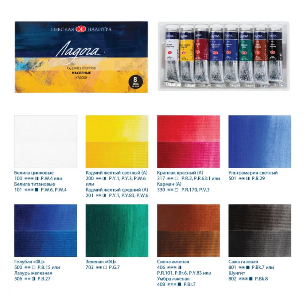 Масляные краски «Ладога» производятся заводом художественных красок Невская палитра, расположенным в городе Санкт-Петербурге. Завод уже более 80 лет выпускает продукцию для профессиональных художников и любителей творчества. В палитре масляных красок «Ладога» дорогие неорганические пигменты были заменены на органические с помощью тщательно подобранных соотношений компонентов, при этом аналоги полностью соответствуют оригинальным цветам. Для удобства пользователя цвета, которые созданы с заменой пигментов, обозначены на этикетке буквой «А» (аналог). Масляные краски «Ладога» хорошо смешиваются между собой. Палитра красок состоит из наиболее востребованных художниками цветов.