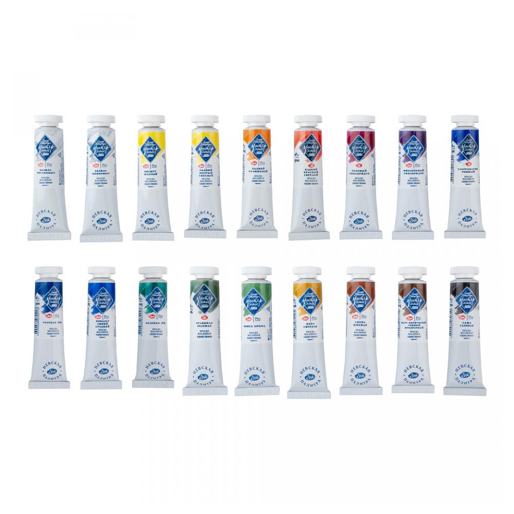 Масляные краски «Мастер-класс» разработаны для профессиональных художников. Изготавливаются по традиционным рецептурам на основе высококачественных пигментов, связующего – специально обработанного льняного масла и натуральных смол, положительным образом влияющих на свойства красок. Тонкодисперсные краски с высокой концентрацией пигмента превосходно смешиваются между собой. Обладают густой консистенцией, позволяющей работать пастозно. Яркость и чистота цвета, высокая светостойкость красок обусловлены применением ценных для живописи неорганических (природные красящие земли, кадмиевые, кобальтовые, железоокисные) и органических пигментов высокого качества. 2 вида белил с составе набора; 16 оттенков из18-ти - монопигментные; натуральные кадмии и кобальт в составе набора; 13 оттенков из 18-ти обладают максимальной светостойкостью; в наборе представлены как укрывистые, так и лессировочные цвета. Состав набора: 101 Белила титановые | 100 Белила цинковые | 272 Висмут желтый | 200 Кадмий желтый светлый | 304 Кадмий оранжевый | 302 Кадмий красный светлый | 324 Розовый хинакридон | 621 Фиолетовый хинакридон | 521 Ультрамарин темный | 500 Голубая «ФЦ» | 505 Кобальт синий средний | 703 Зеленая ФЦ | 716 Травяная зеленая | 704 Окись хрома | 206 Охра светлая | 406 Сиена жженая | 404 Марс коричневый темный прозрачный | 801 Сажа газовая