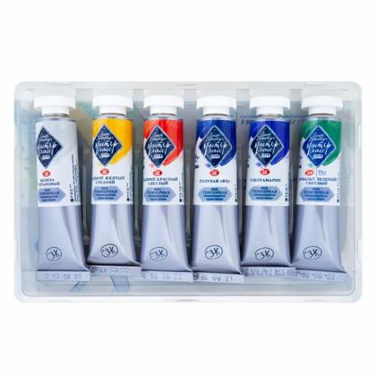 Художественные темперные поливинилацетатные краски «Мастер-Класс» изготавливаются на основе органических и неорганических пигментов и поливинилацетатной дисперсии и являются традиционным материалом для живописи. Благодаря тщательно подобранным компонентам темперные краски прекрасно подходят для живописных и декоративно-оформительских работ. Большинство цветов в палитре монопигментные и обладают высочайшим показателем светостойкости. Все краски выкопигментированные, яркие и чистые. Темпера «Мастер-Класс» позволяет получить многообразие благородных оттенков в разбелах и смесях. Краски легко наносятся на бумагу, картон, дерево, керамику, грунтованный и негрунтованный холст. При высыхании образуют эластичную, непрозрачную, несмываемую пленку. Палитра цветов набора Basic colours из 6 цветов в наборе «Мастер-Класс» позволяет решить множество творческих задач художника: белила титановые, кадмий желтый средний, кадмий красный светлый, голубая фц, ультрамарин, кобальт зеленый светлый.