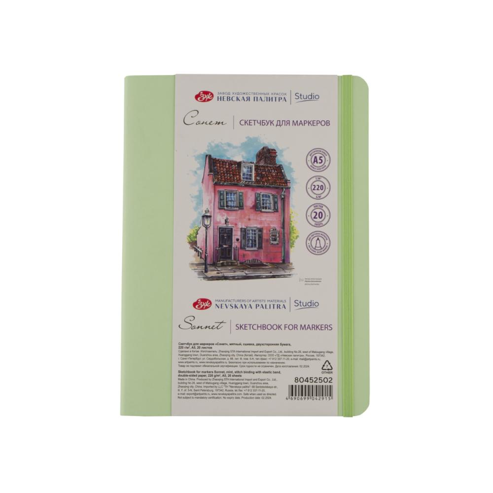 Скетчбук для маркеров "Сонет" А5, 220 г/м2, 20 л., мятный, сшивка, двухсторонняя бумага