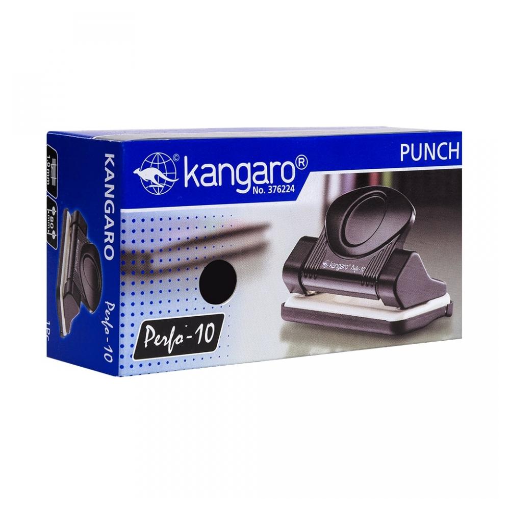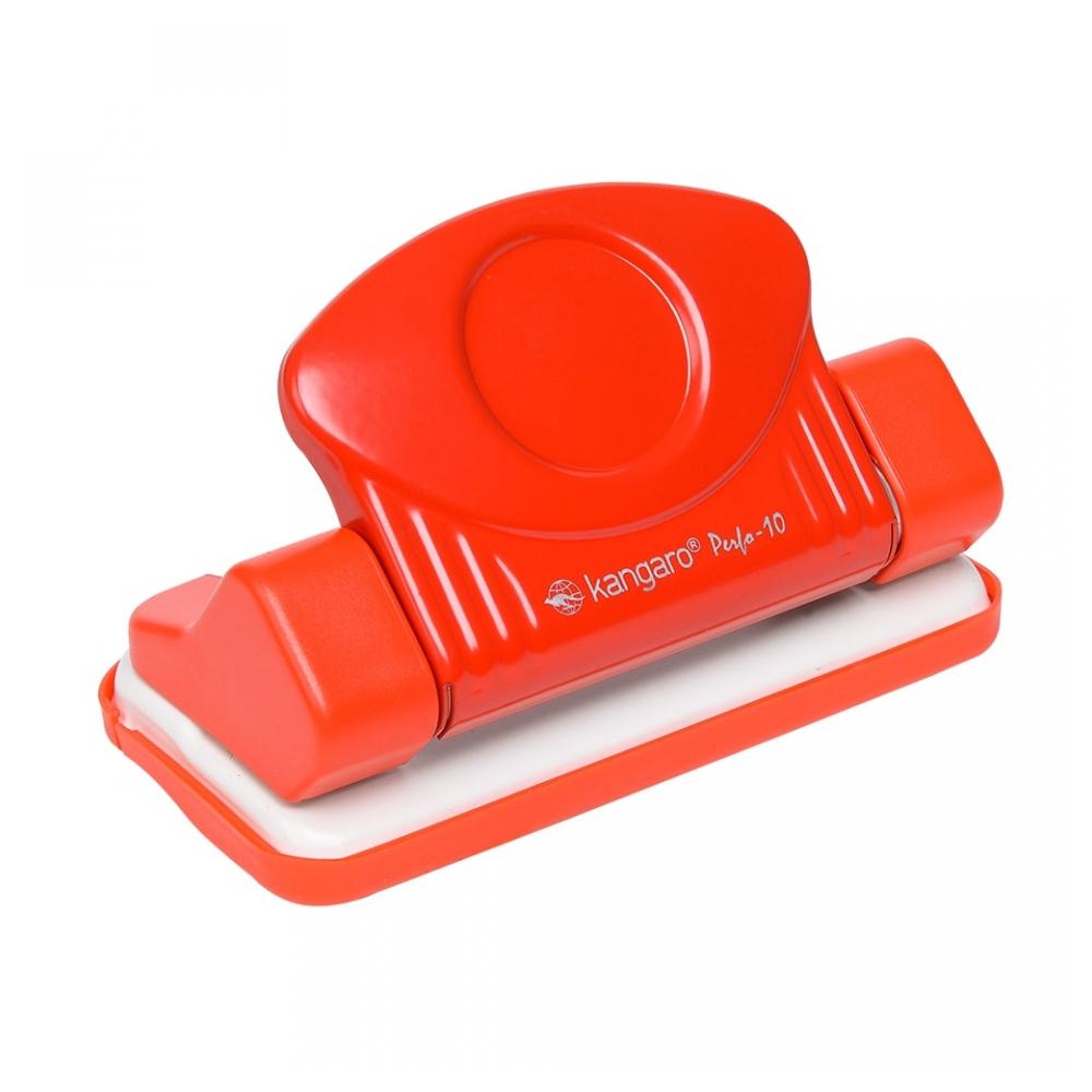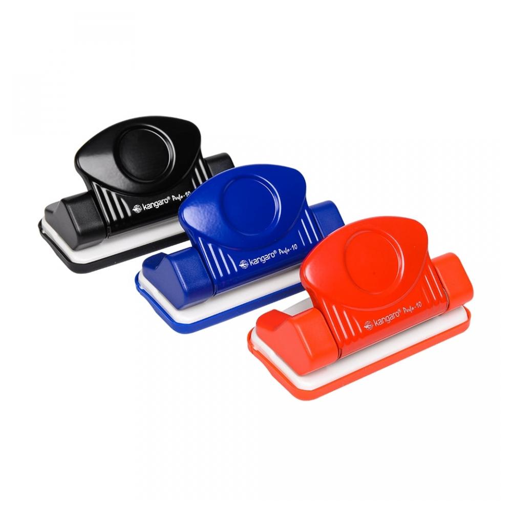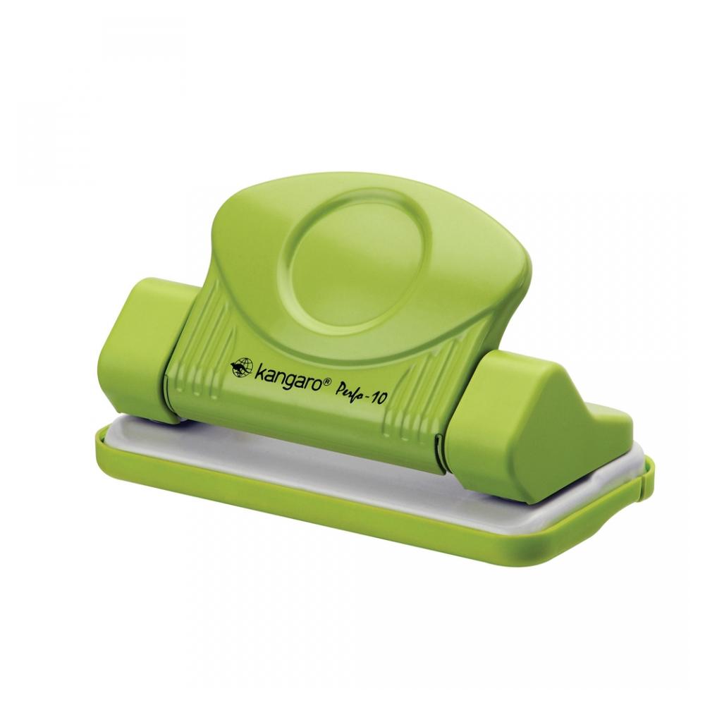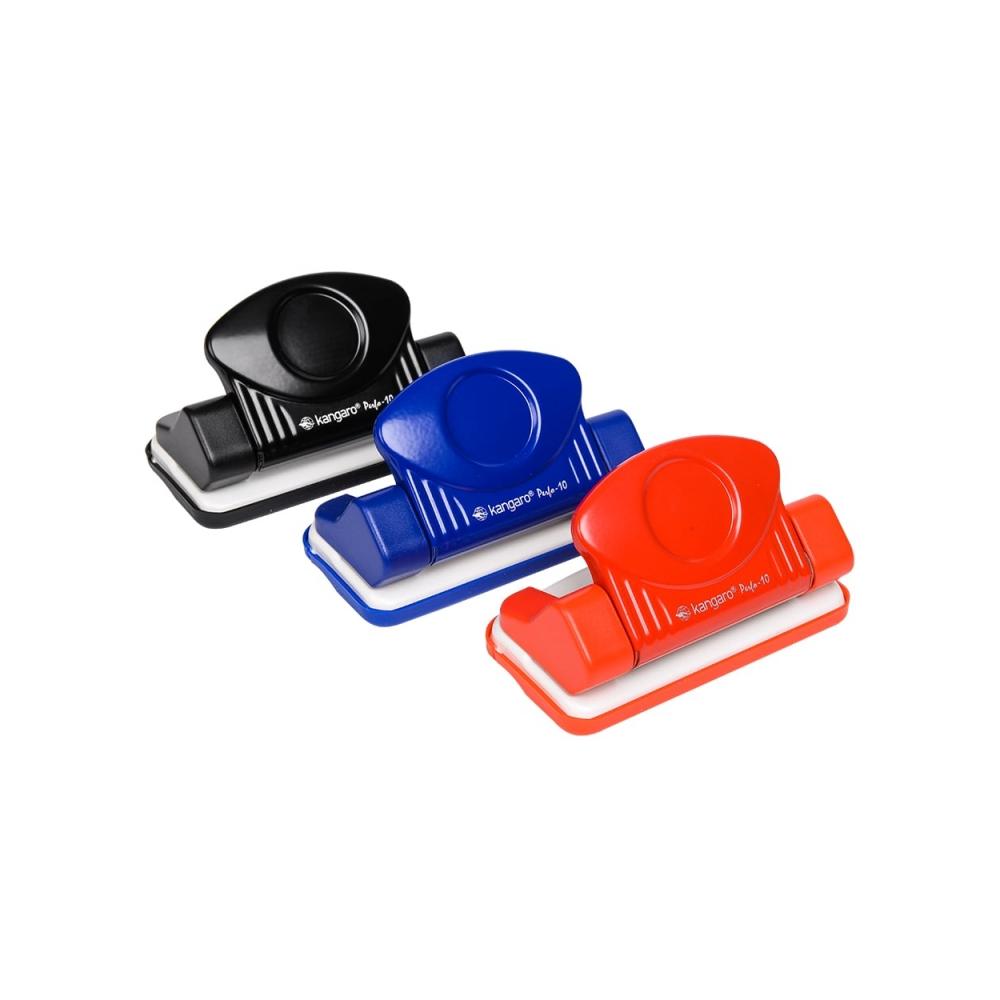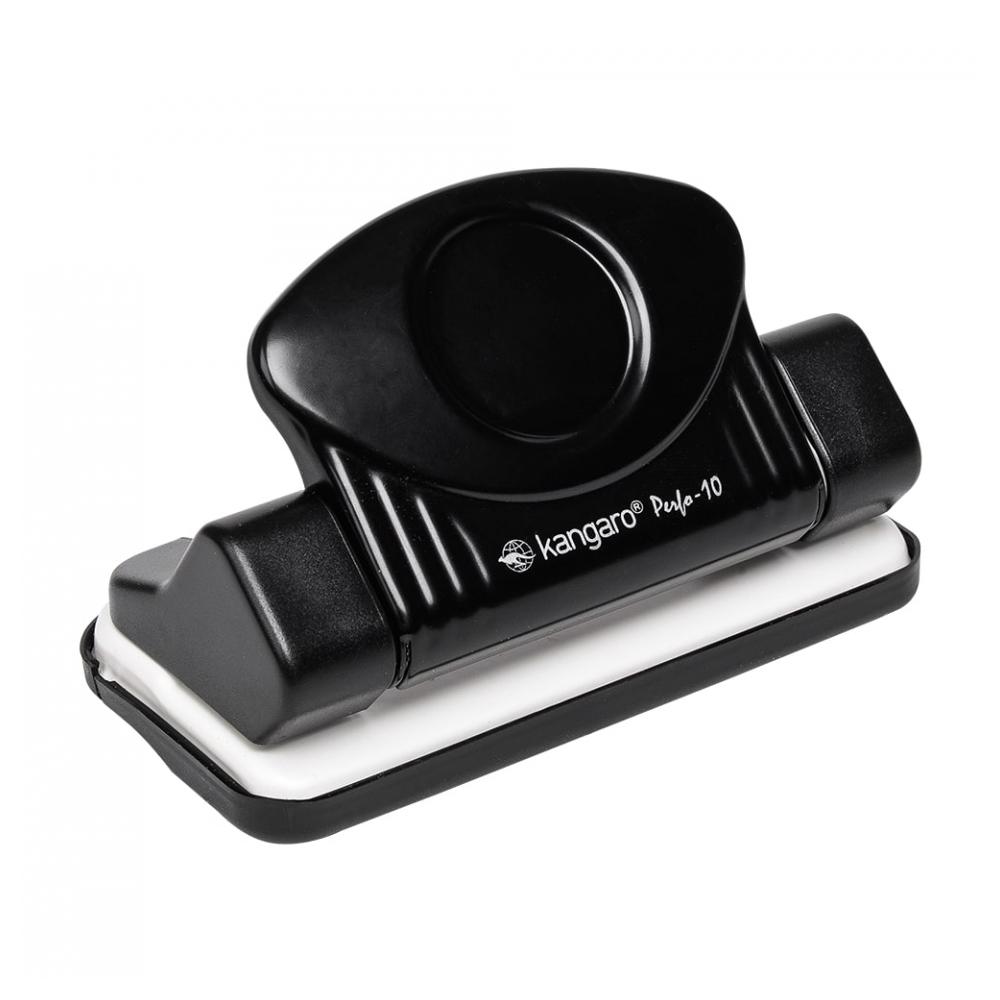 Компактный металлический дырокол Kangaro Perfo-10 с необычным дизайном. Прочная металлическая конструкция. Пробивает 10 листов.плотностью 80г/м Расстояние между отверстиями 80 мм. Диаметр отверстий — 5,5 мм. Съемный лоток для мусора.