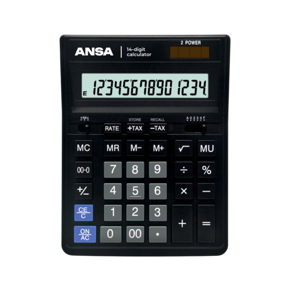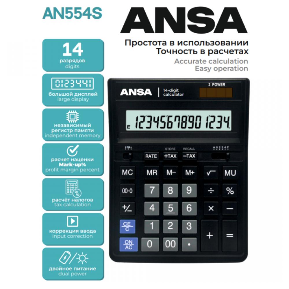 14-ти разрядный настольный калькулятор ANSA AN554S предназначен для выполнения арифметических расчетов. Набор функций поможет автоматизировать ваши расчёты: конвертация валют, расчёт наценки, смена знака, вычисление квадратного корня, коррекция последнего введенного значения, клавиша «00», Двойное питание (солнечная батарея + батарея (LR54)) и автоматическое отключение увеличивают срок службы. Размер калькулятора – 206х157х32 мм, вес – 208 г, цвет – чёрный. Разрядность: 14; Клавиша «00»; Конвертация валют,; Расчёт наценки; Квадратный корень; Тип питания – двойное (солнечная батарея/батарейка GP189/LR54/AG10/L1131); Гарантийный срок: 3 года.