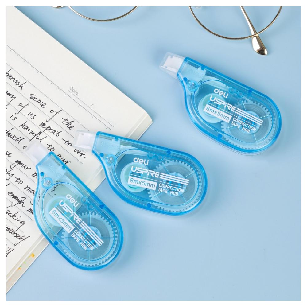 Корректор роллер Deli "Uspire" отлично справляется с корректировками текста. Очень удобен в использовании. Размер ленты: 6 м*5 мм. Цвет корпуса: голубой.