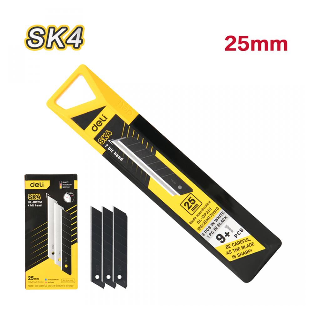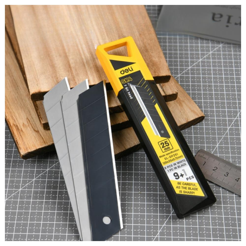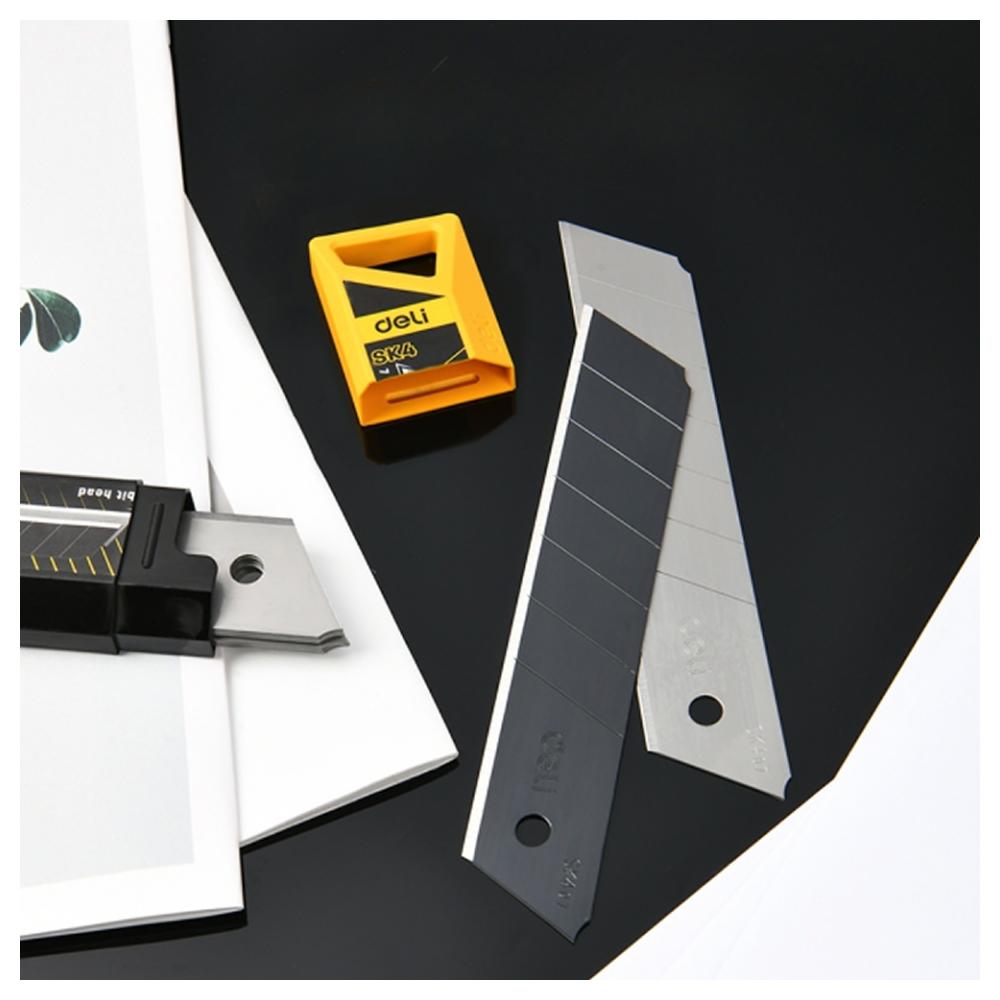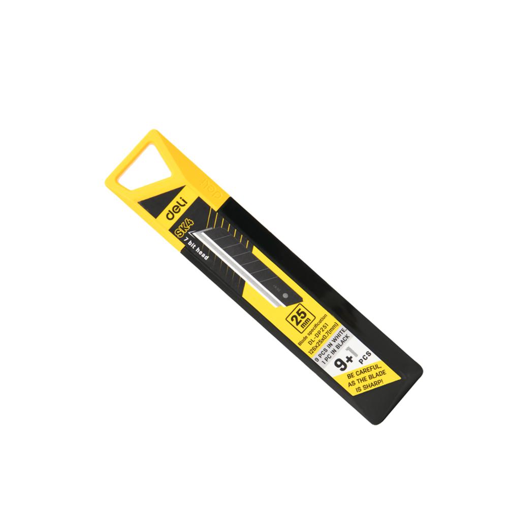Лезвия изготовлены из прочной стали SK4, что обеспечивает увеличение срока службы на 50%. Благодаря термообработке достигается высокая твёрдость и износостойкость режущей кромки. Антикоррозийное покрытие защищает лезвия от ржавчины и продлевает срок их эксплуатации. В комплект входят 1 чёрное и 9 серебристых лезвий. Упакованы в цветную коробку. Тип лезвия сегментированное Серия Yellow Series (Deli) Ширина лезвия (мм) 25