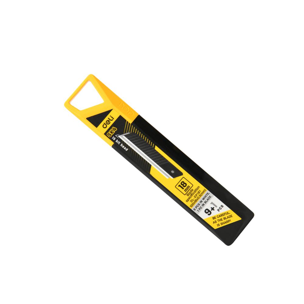 Лезвия изготовлены из высококачественной стали SK4, что увеличивает срок их службы на 50%. Благодаря термообработке обеспечивается превосходная твёрдость и устойчивость к износу. Антикоррозийное покрытие защищает поверхность от ржавчины и продлевает срок эксплуатации. В комплект входит 1 чёрное и 9 серебристых лезвий, что делает набор универсальным для различных задач. Упакованы в цветную коробку. Тип лезвия сегментированное Серия Yellow Series (Deli) Ширина лезвия (мм) 18