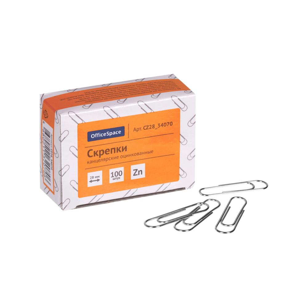 Оцинкованные канцелярские скрепки "OfficeSpace" овальной формы. Отличный инструмент для работы с документами, не пачкают и не деформируют бумагу, не ржавеют, надежно скрепляют документы. Упакованы в картонную коробку по 100 шт. Длина - 28 мм. Цвет – серебристый.