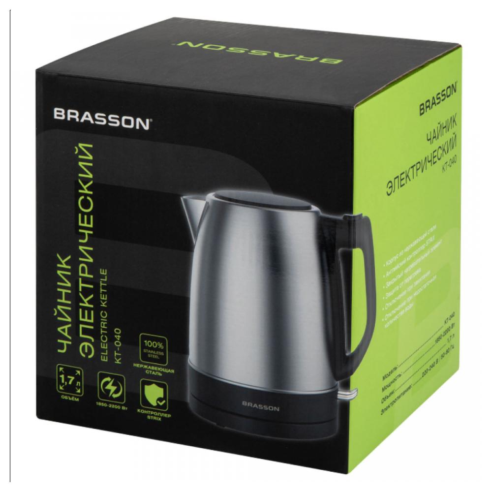 Чайник BRASSON KT-040 – это надёжный и функциональный помощник на вашей кухне. Стильный корпус идеально впишется в любой интерьер, а высококачественная нержавеющая сталь обеспечивает долговечность и безопасность использования. Мощность чайника составляет 2200 Вт, что позволяет вскипятить воду всего за несколько минут. Объёма 1,7 л достаточно для приготовления кофе или других напитков на 6-7 человек за один раз. Он подойдёт как для большой семьи, так и для офиса. Индикация включения и индикатор уровня воды делают использование чайника ещё более удобным. Контроллер STRIX обеспечивает надежность и безопасность устройства. Благодаря такому контроллеру чайник автоматически отключается при закипании, имеет защиту от перегрева и включения без воды. В носике расположен съёмный фильтр от накипи, который легко извлечь и очистить. Не откладывайте комфорт на потом – превратите каждое утро в удовольствие с электрическим чайником BRASSON KT-040! Характеристики: Тип нагревательного элемента: закрытый Автоотключение при закипании: да Отключение при отсутствии воды: да Индикатор включения: да Индикация уровня воды: да Вращение на 360°: да Фильтр от накипи: да Длина шнура: 0,75 м Цвет корпуса: стальной Габариты (Ш×В×Г): 195×243×220 мм Вес (без упаковки): 0,93 кг Гарантия - 12 месяцев.