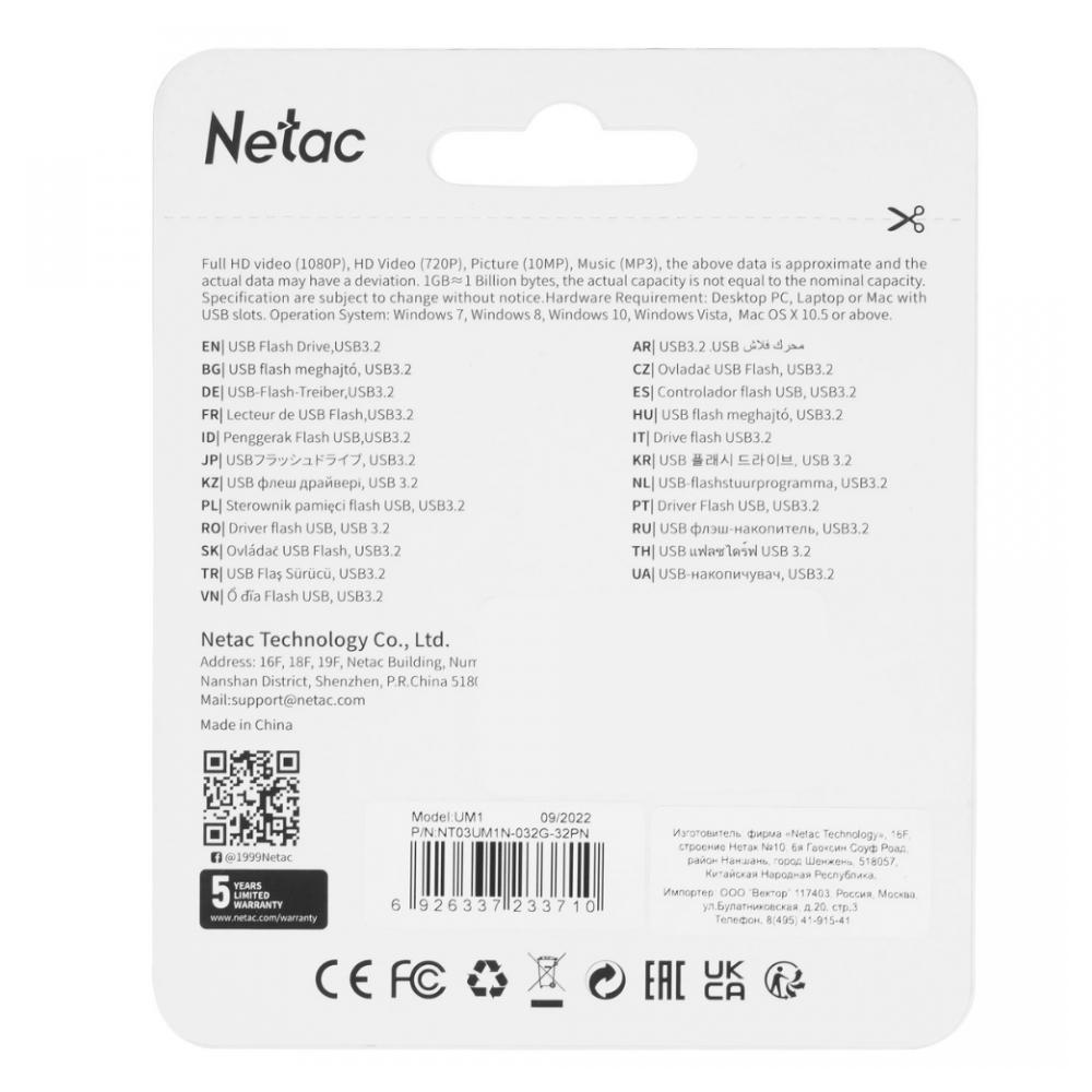 Память USB Flash 32 ГБ Netac UM1 [NT03UM1N-032G-32PN] – 32-гигабайтный флеш-накопитель, способный принести пользу как дома, так и в офисе. Устройство подходит для хранения и перемещения большого количества крупных файлов. Накопитель располагает поддержкой стандарта USB 3.2 Gen1. Пропускная способность такого USB-подключения равна 5 Гбит/с. Есть и обратная совместимость: накопитель можно подключать к USB-портам любых предыдущих версий. Память USB Flash 32 ГБ Netac UM1 [NT03UM1N-032G-32PN] использует для подключения наиболее широко распространенный USB-разъем – Type-A. Накопитель совместим не только с компьютерами, но и с другой техникой, например – с телевизорами, музыкальными центрами и автомобильными проигрывателями. Конструкцией накопителя предусмотрено отверстие для размещения шнурка или ремешка. Корпус устройства – металлический. Накопитель обладает высокой ударостойкостью. Модель имеет практичный серебристый цвет. На таком фоне подавляющее большинство загрязнений малозаметны. Накопитель очень легкий: его масса равна лишь 5.6 г. Гарантийный срок 6 месяцев