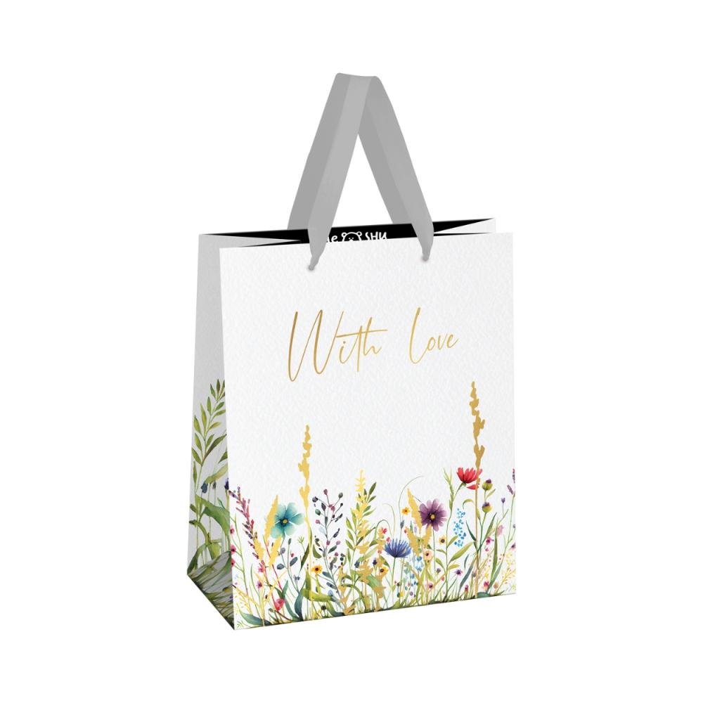 Подарочный пакет MESHU "With love" – беспроигрышный способ преподнести подарок красиво. Размер подарочного пакета – 18*23*10 см. Изготовлен из плотного мелованного картона с матовой ламинацией. Дизайн пакета вдохновлен мотивами лугов и полей, что делает его идеальным выбором для тех, кто ценит естественность и гармонию. На лицевой стороне пакета изображен яркий и стильный узор, вдохновленный природой. Получать подарки всегда приятно, а красиво оформленные подарки приятнее вдвойне! Эксклюзивный дизайн, разнообразие отделок и качество – отличительные черты продукции MESHU, воплотившиеся в подарочных пакетах. Ручки пакета – лента, которая отличается высокой прочностью и насыщенностью цвета. • Материал: мелованный картон; • Размер пакета: 18*23*10 см; • Вид ручек: лента