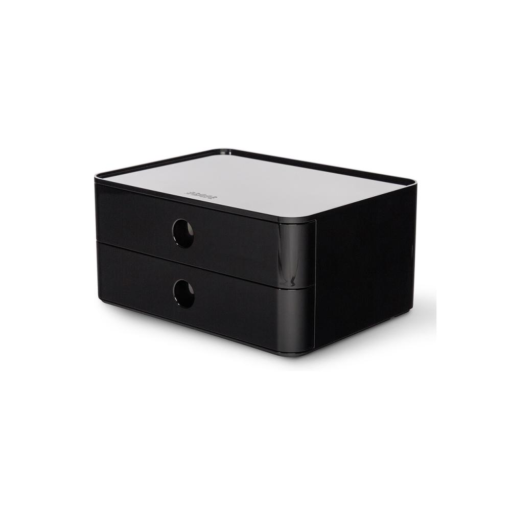 Стеллаж с двумя ящиками и съемными разделителями премиум-качества. Уникальный и инновационный дизайн с глянцевой отделкой для широкого спектра применений: в офисе, на совещаниях или дома. Ящики с плавным ходом и съёмными разделителями для идеальной организации пространства. В основании предусмотрены кабельные каналы. Не скользит благодаря удобным для мебели резиновым ножкам. При необходимости можно складывать друг на друга с другими ящичками Изготовлен из высококачественного, особо прочного АБС-пластика