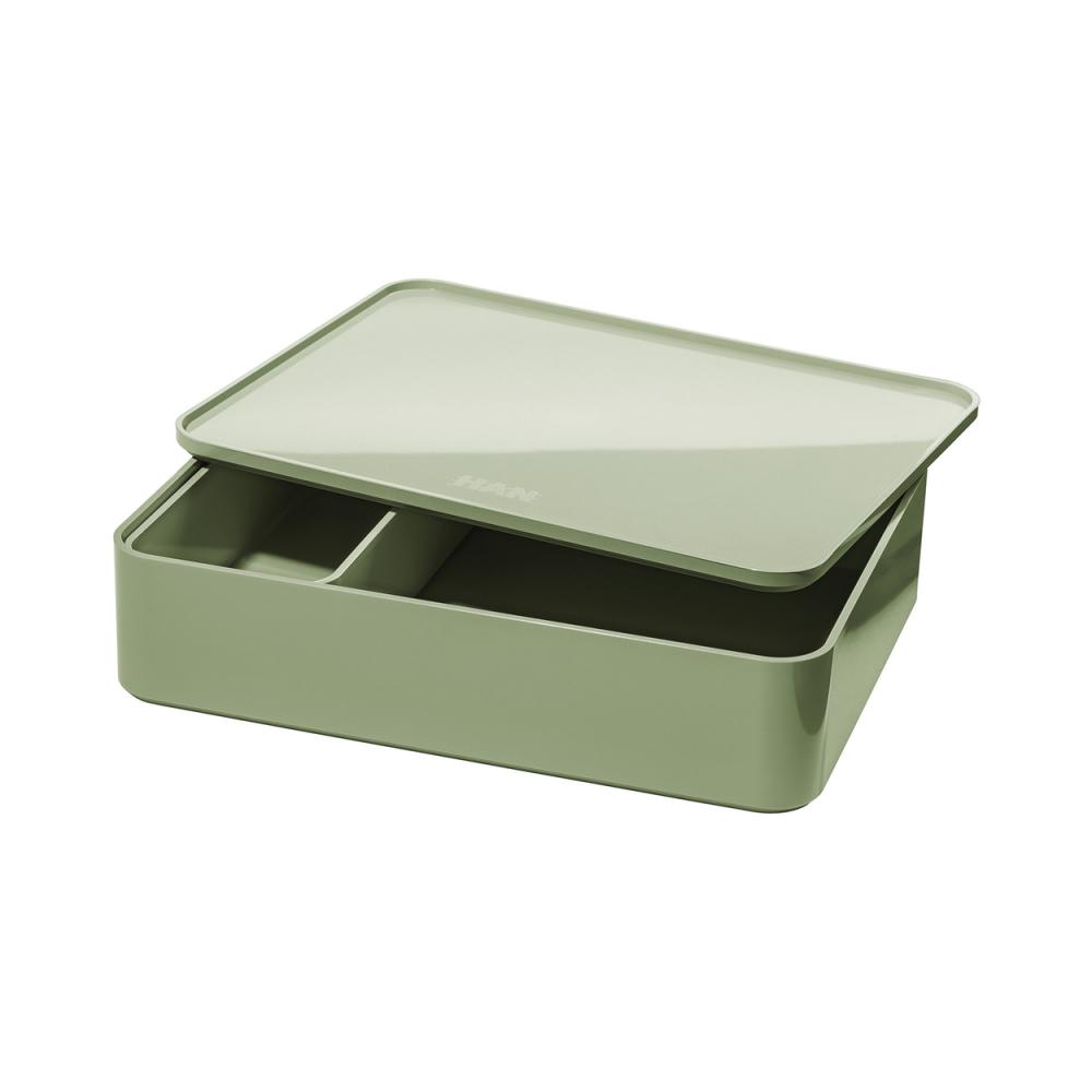 Практичный, штабелируемый ящик для столовых принадлежностей с выдвижным и съемным внутренним лотком и крышкой высочайшего качества. Уникальный и инновационный дизайн с глянцевой отделкой для широкого спектра применений: в офисе, на совещаниях или дома. Крышку можно использовать в качестве подноса или хранить под ящиком для столовых приборов, когда она не используется. Не скользит благодаря удобным для мебели резиновым ножкам. При необходимости можно сложить вместе с несколькими ящичками.