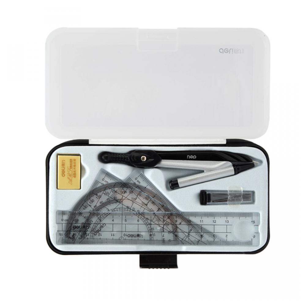 Набор для черчения Deli 72150 — это компактный и надёжный комплект из 7 предметов, выполненный из прочного серебристого пластика, идеально подходящий для школьников, студентов и начинающих дизайнеров. Внутри — всё необходимое для точных построений: циркуль с регулируемым радиусом, линейка, транспортир и два угольника, а также дополнительные аксессуары для удобной работы. Эргономичный дизайн, чёткая разметка и устойчивость к износу делают этот набор практичным помощником в учебе, чертёжных задачах и графических проектах.