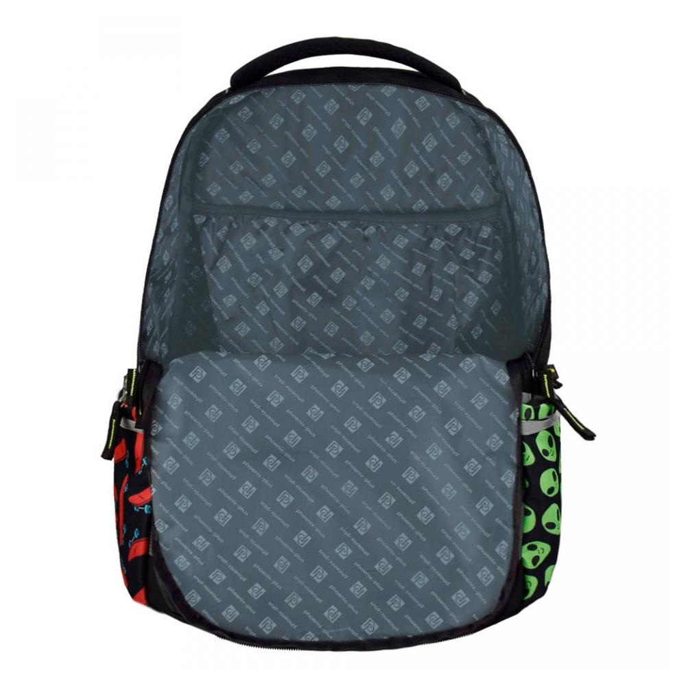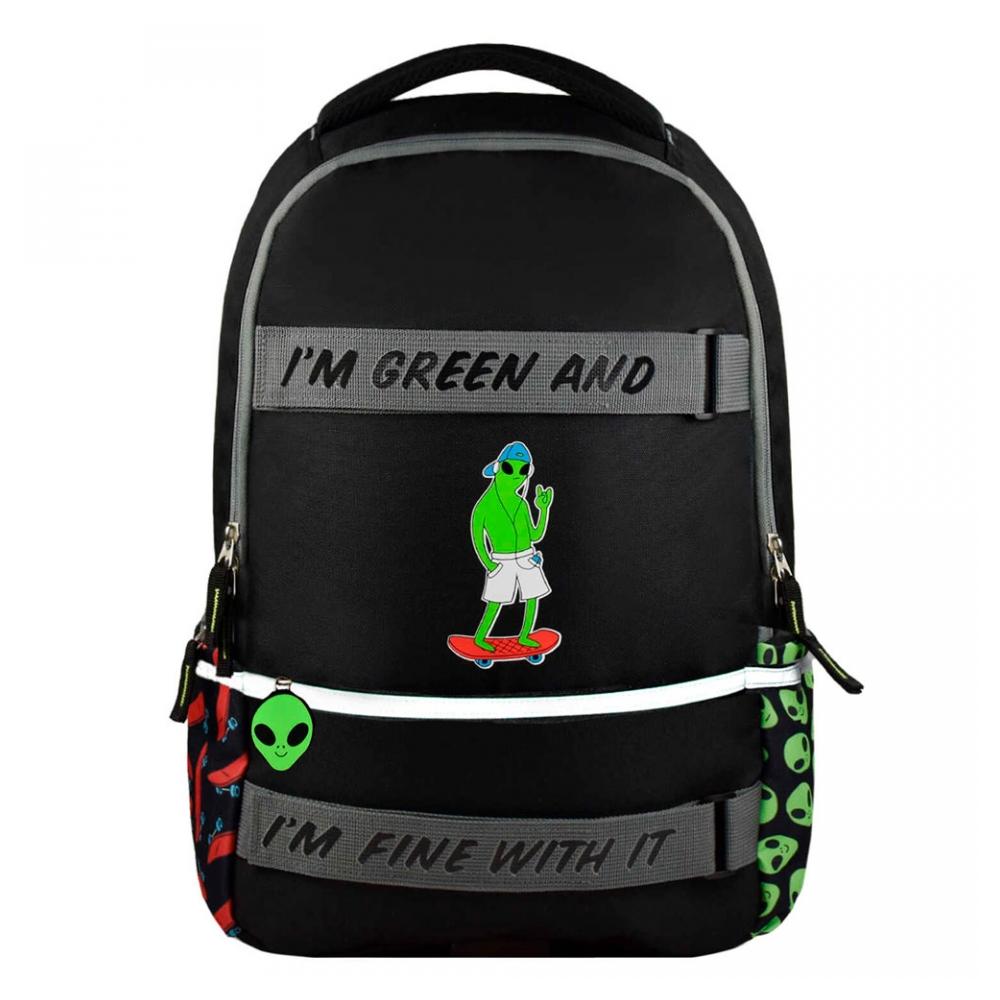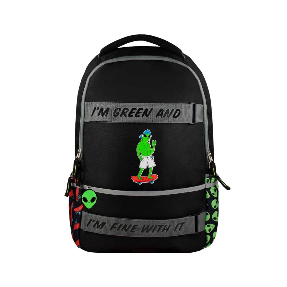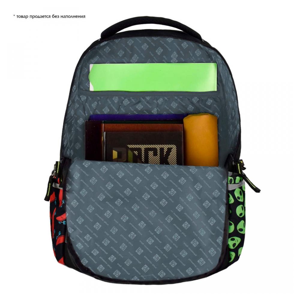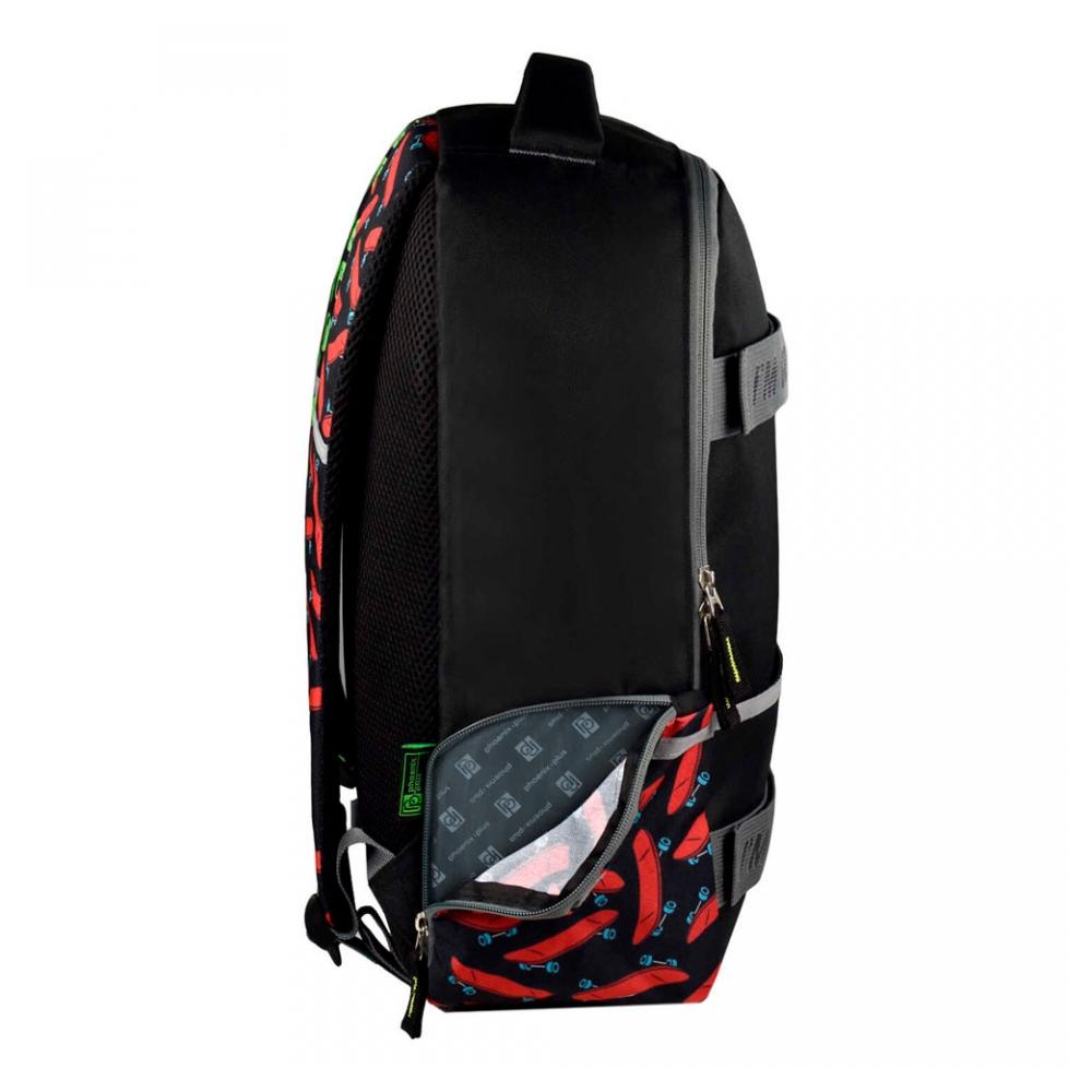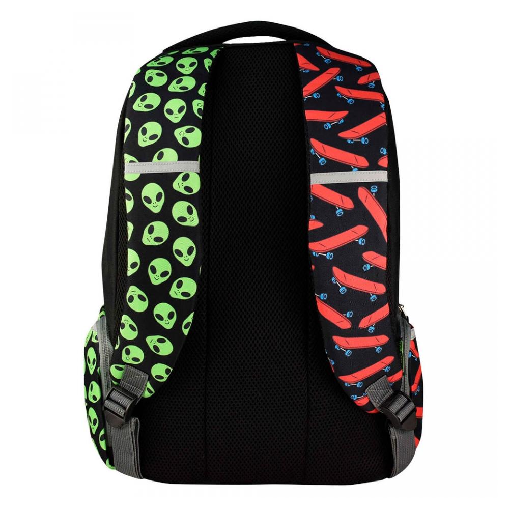 Классический школьный рюкзак на одно отделение. Три дополнительных наружных кармана для различных мелочей. Застёжка - молния. Материал собачки: лента репсовая, резина. Тип спинки - уплотненная спинка из сетчатой ткани и поролона. Тип дна - уплотнённое дно. Отделка: сублимационная печать, шелкография. Особенности: водоотталкивающая ткань, крепления для скейборда на липучке, лямки, регулируемые по длине, светоотражающие элементы.