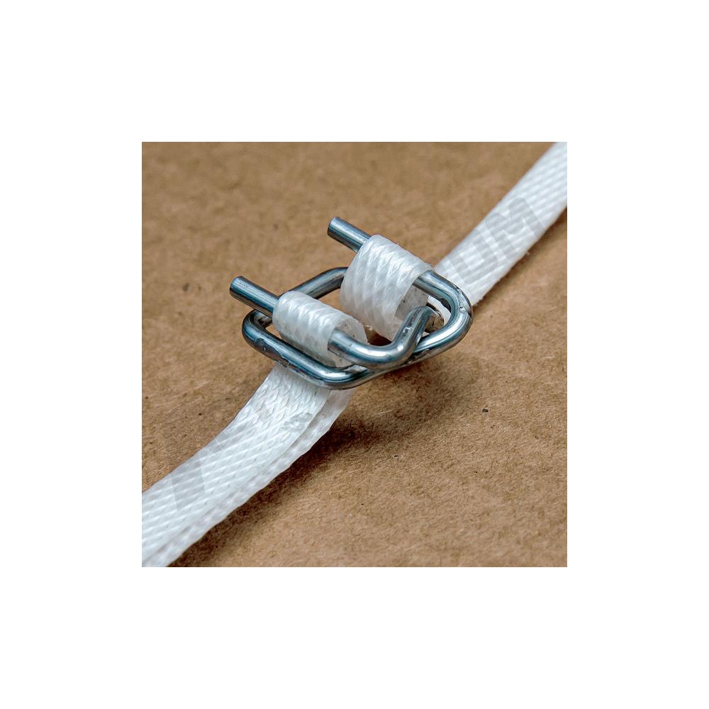 Применение проволочных скоб (пряжек) для закрепления концов упаковочной полимерной ленты, хоть и не является самым технологичным способом и имеет некоторые недостатки, обеспечивает высокую прочность соединения, не требует дорогостоящего оборудования, позволяет производить подтяжку ленты на уже упакованном грузе, не выдвигает особых требований к температурным условиям, в которых выполняется обвязка груза. Это делает скрепление концов полимерных лент с помощью пряжек оптимальным выбором для многих применений.
